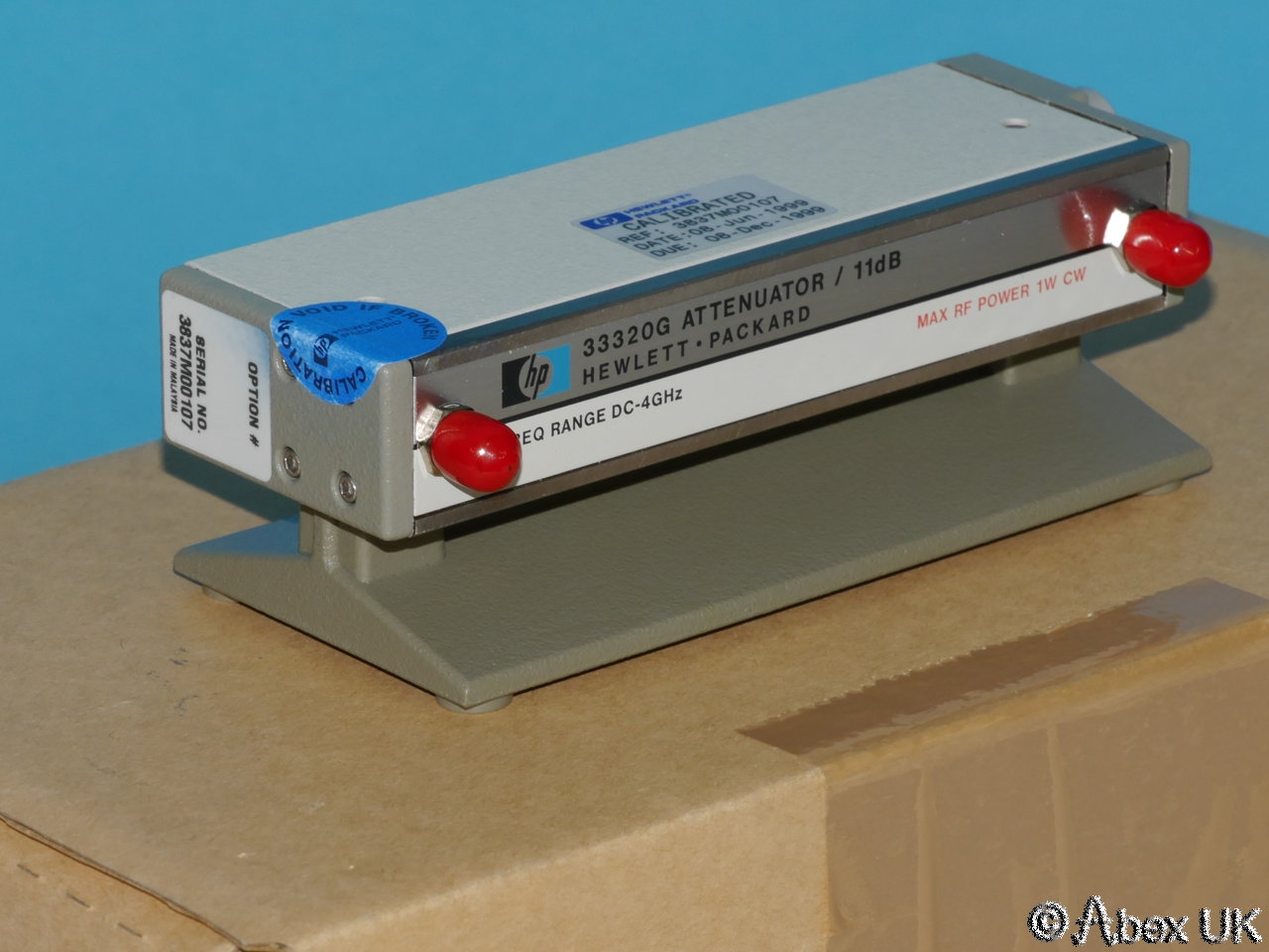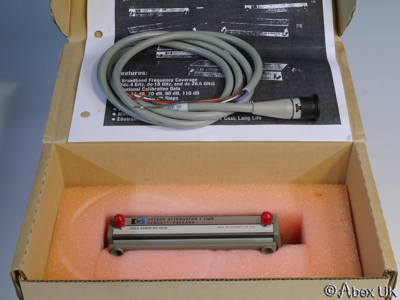 NOS (New, Old Stock) HP (Agilent) 33320G step attenuator, 0-11dB, 1dB steps, 4GHz, remote program. Box opened only for photography, unused item with control cable and datasheet hard copy.