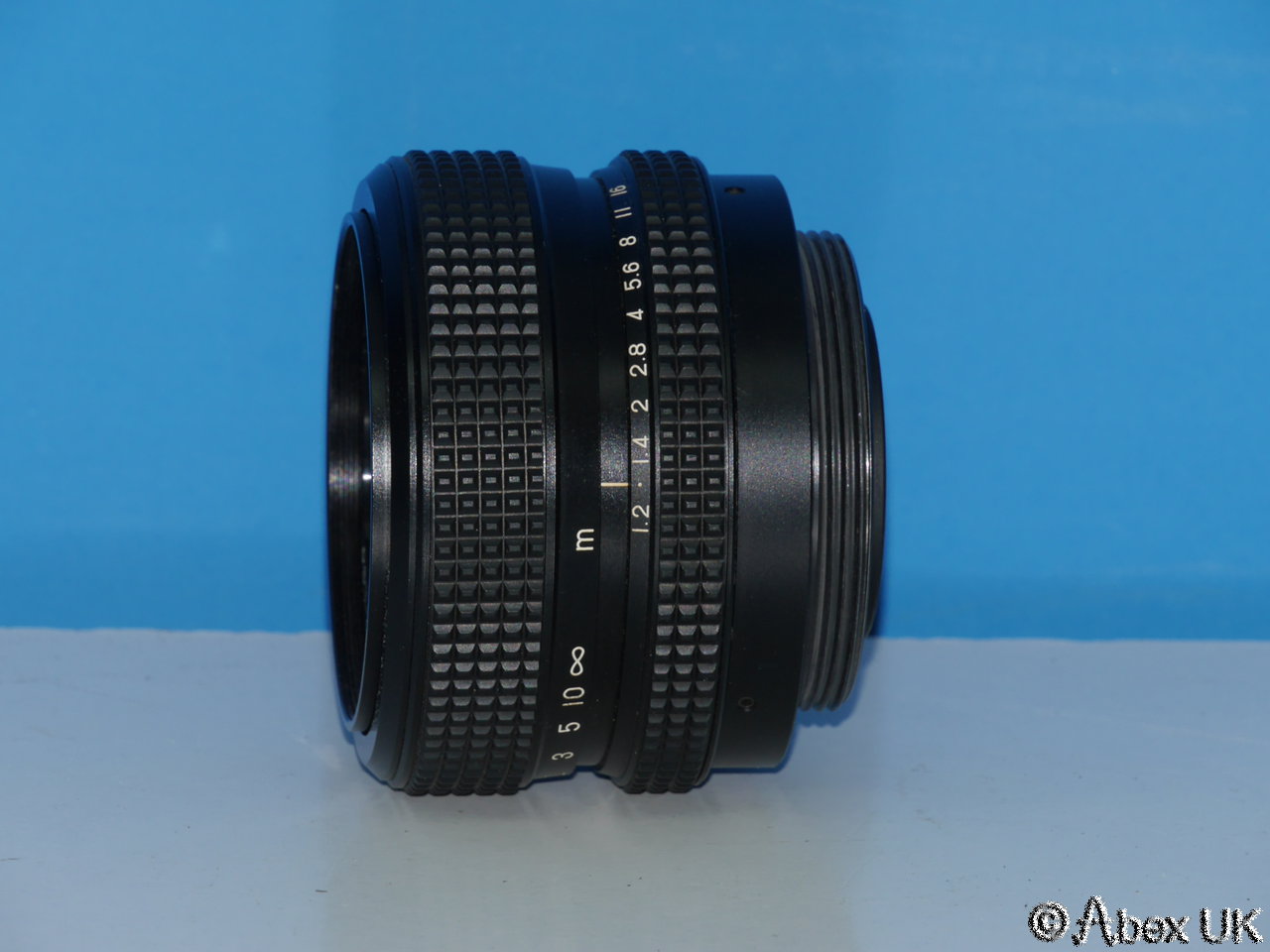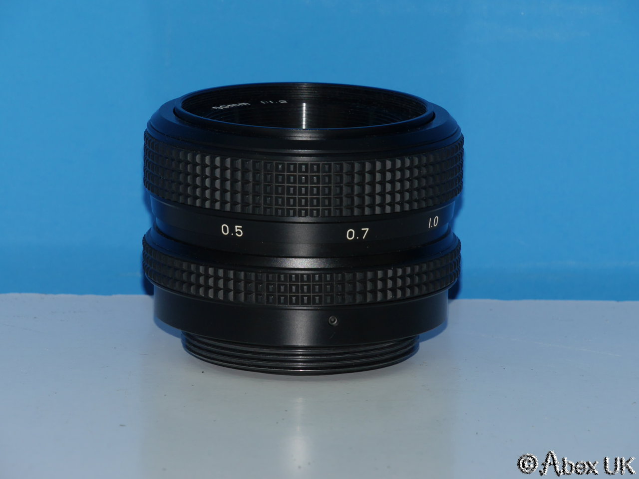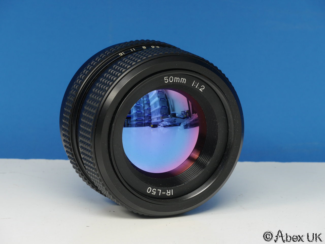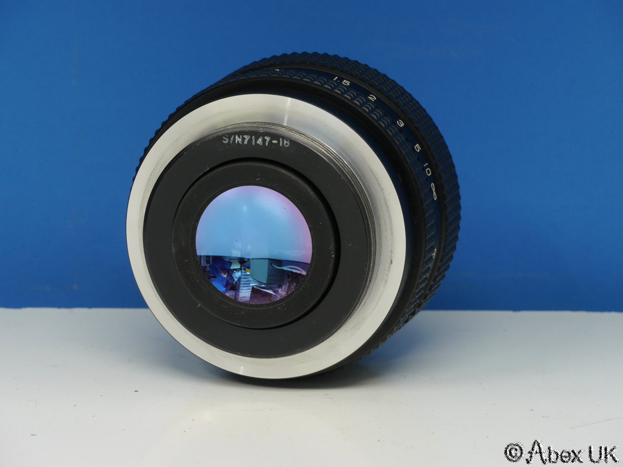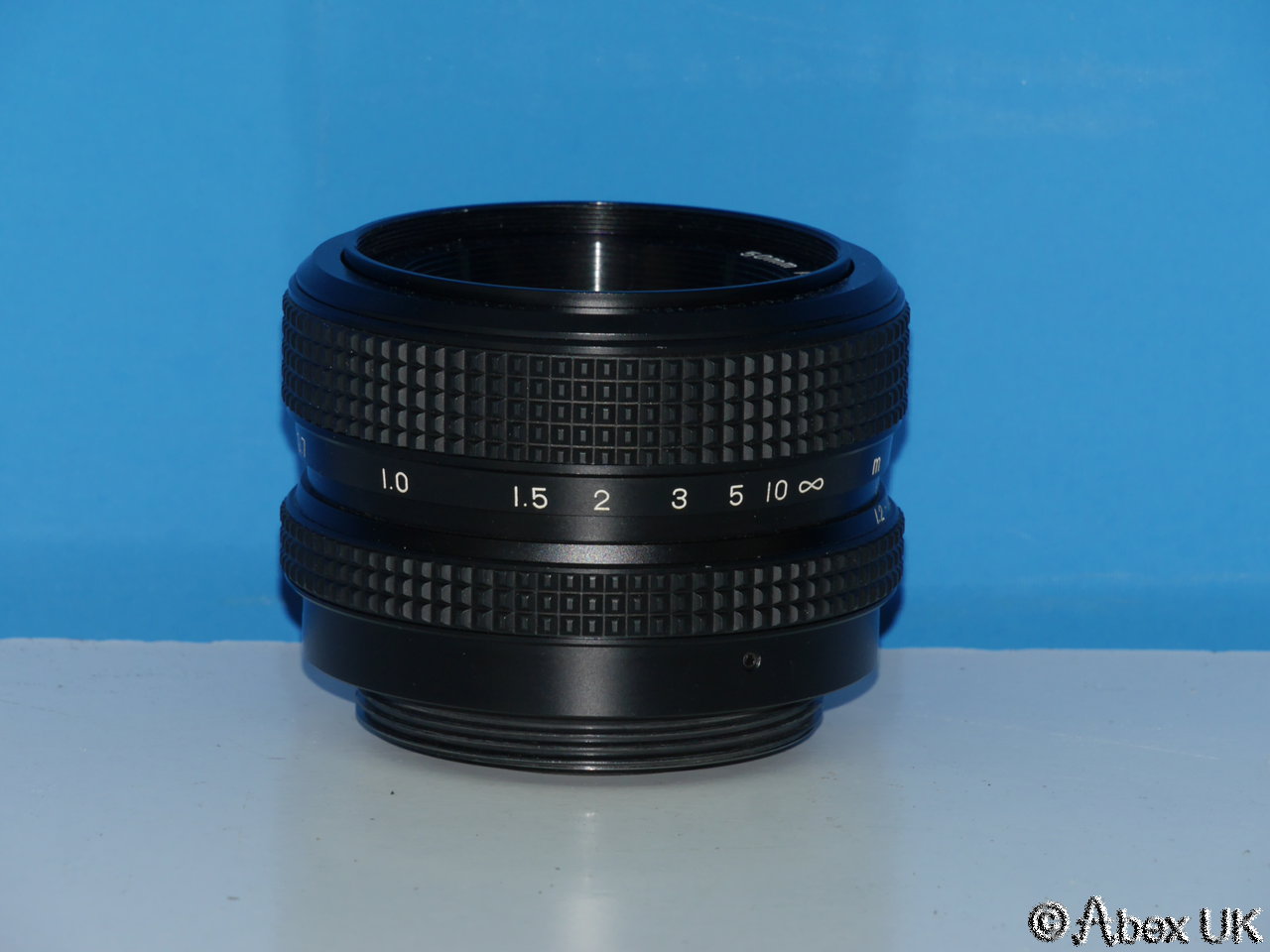 This lens was manufactured by Mitsubishi for thermal imager use. It has a focus ring calibrated from 0.5m - infinity, and an aperture ring calibrated from F1.2 - F16.