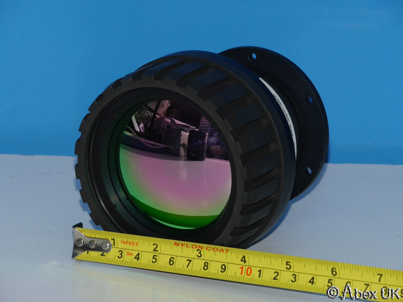 This lens was manufactured by Pilkington for thermal imager use. It has a moderately large front element, the aperture is 75mm. The markings indicate it is a fast F1.0.