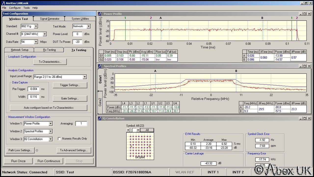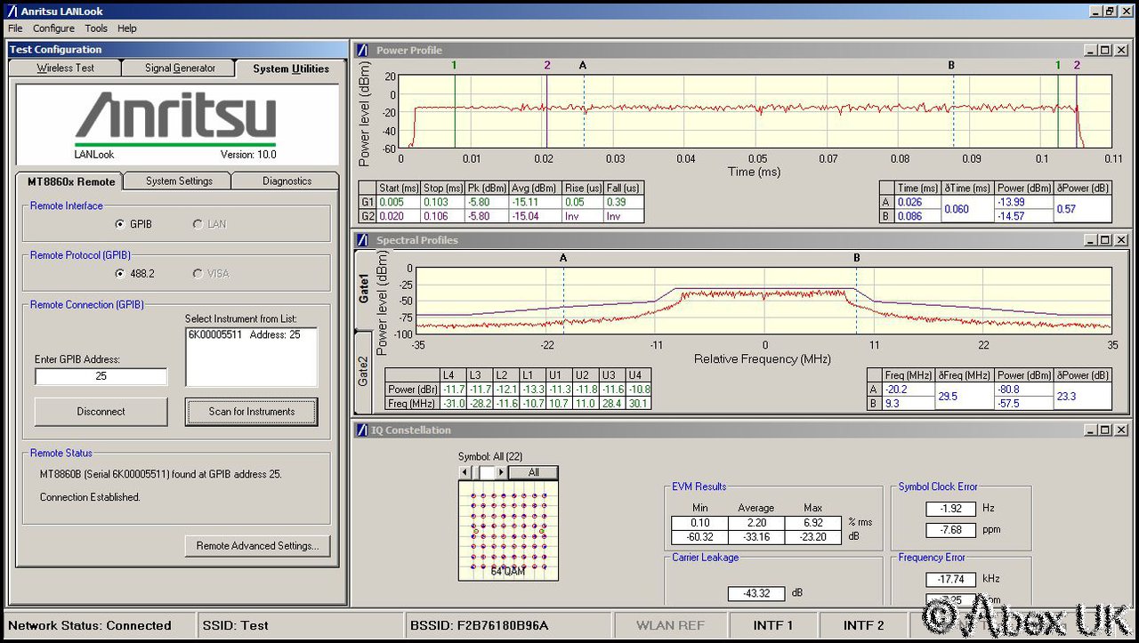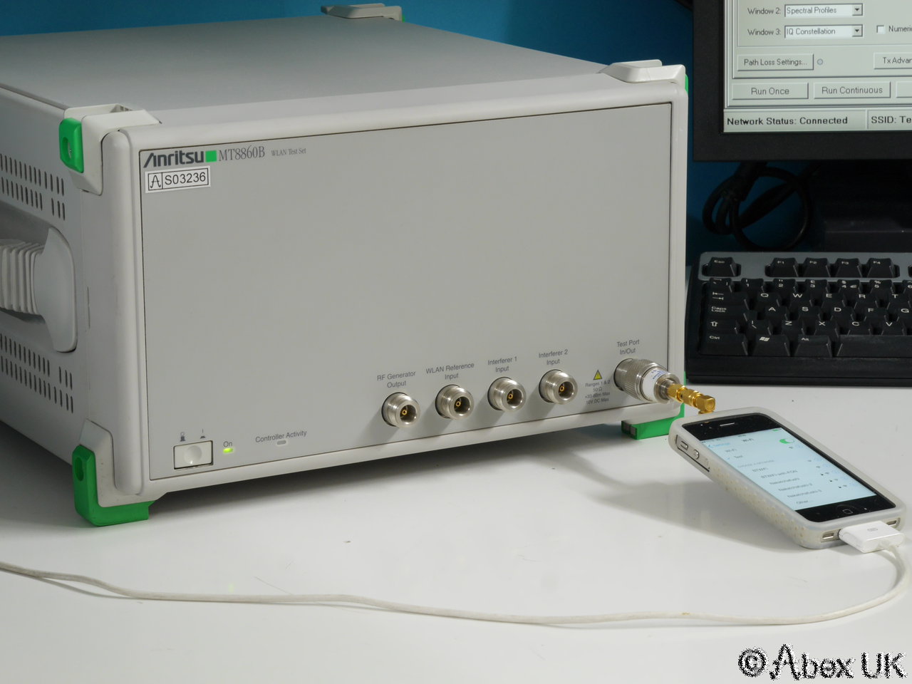 The Anritsu MT8860Bis a comprehensive WLAN test set which will provide a new network connection if required, or connect to an existing network. Once connected, the receive and transmit parameters of the DUT are displayed on an external PC. As shown below, it is simple to connect wirelessly to stand-alone devices such as an iPhone. ( Anritsu LANLook software is required on the PC)