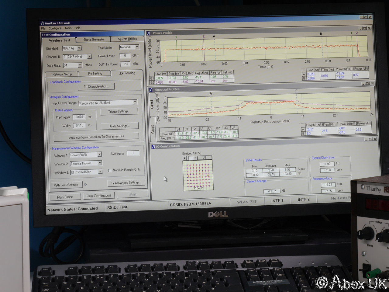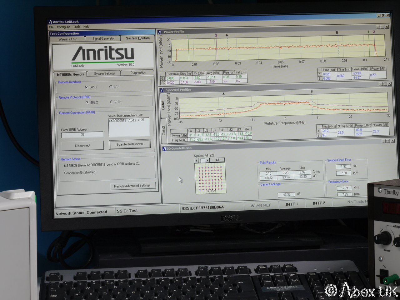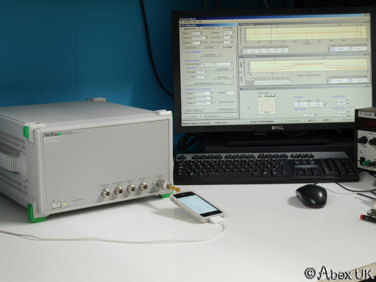 The Anritsu MT8860Bis a comprehensive WLAN test set which will provide a new network connection if required, or connect to an existing network. Once connected, the receive and transmit parameters of the DUT are displayed on an external PC. As shown below, it is simple to connect wirelessly to stand-alone devices such as an iPhone. ( Anritsu LANLook software is required on the PC)