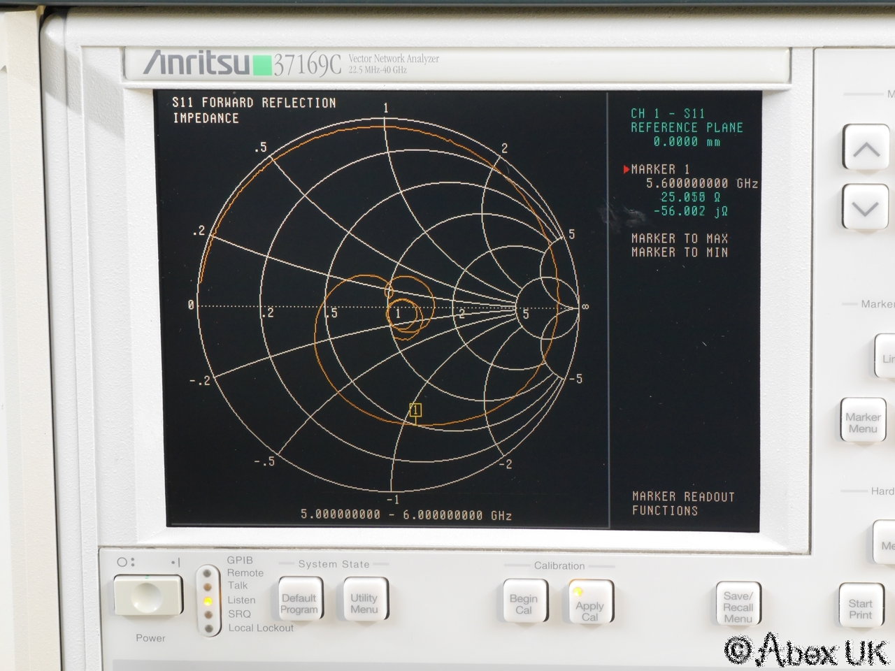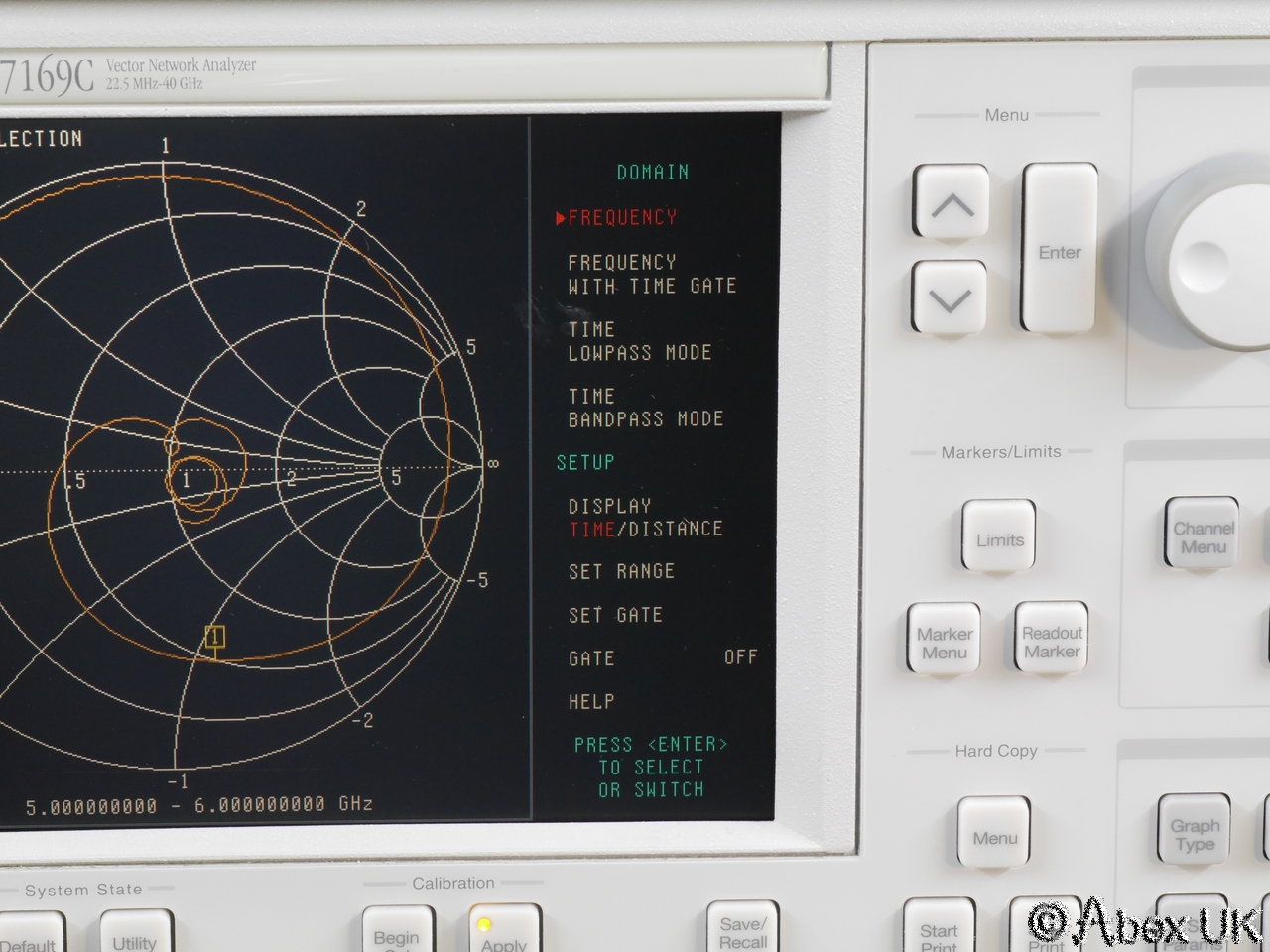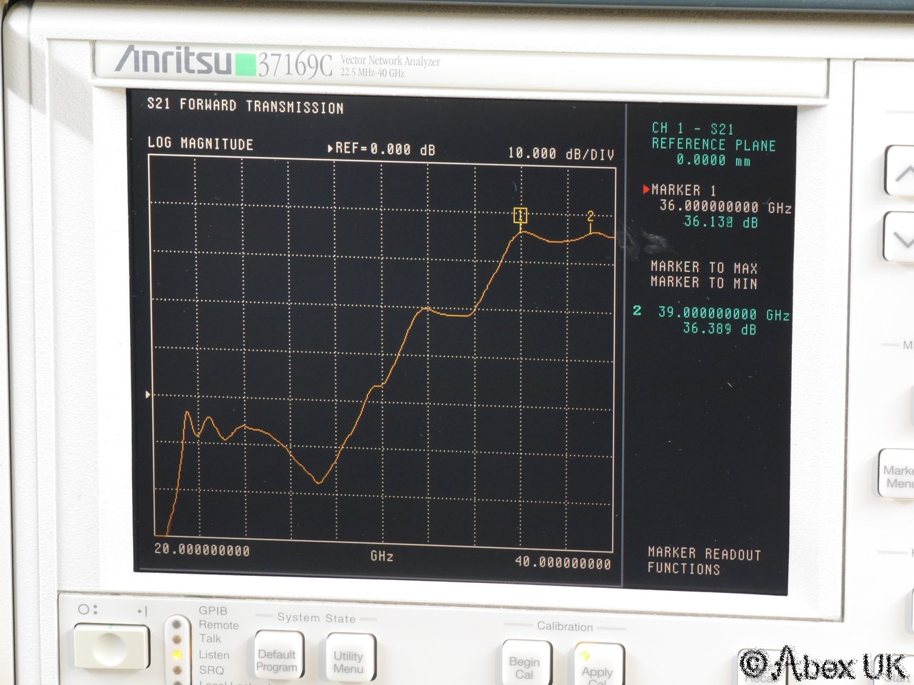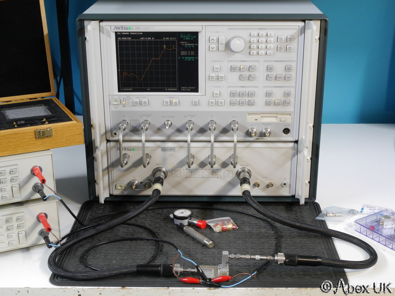 This is the Anritsu (Wiltron) 37169C, a 22.5MHz - 40GHz vector network analyser. This unit comes with the SM5392 s-parameter test set, which is equipped with bias tees for active device measurement, and a port-2 attenuator (optional when new). Other options include time domain, the high stability ovened timebase, and 1Hz frequency resolution. The interesting and useful characteristic of the 37169 vs a 37269 or 37369 is that you can direct access the receiver channels.