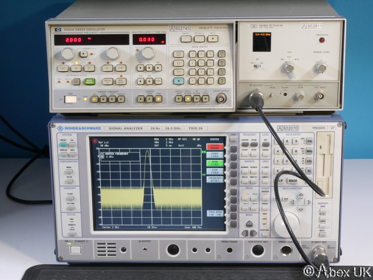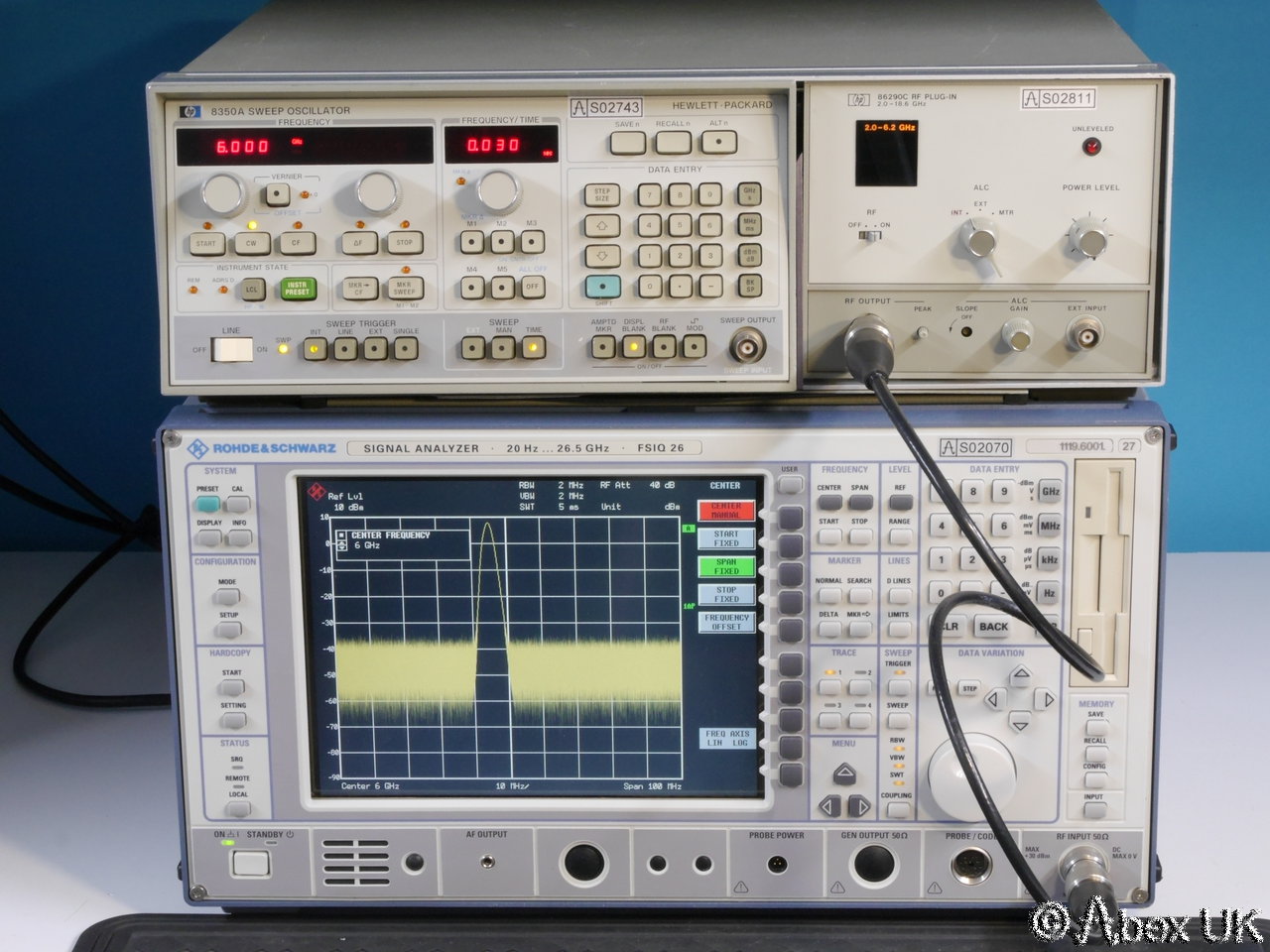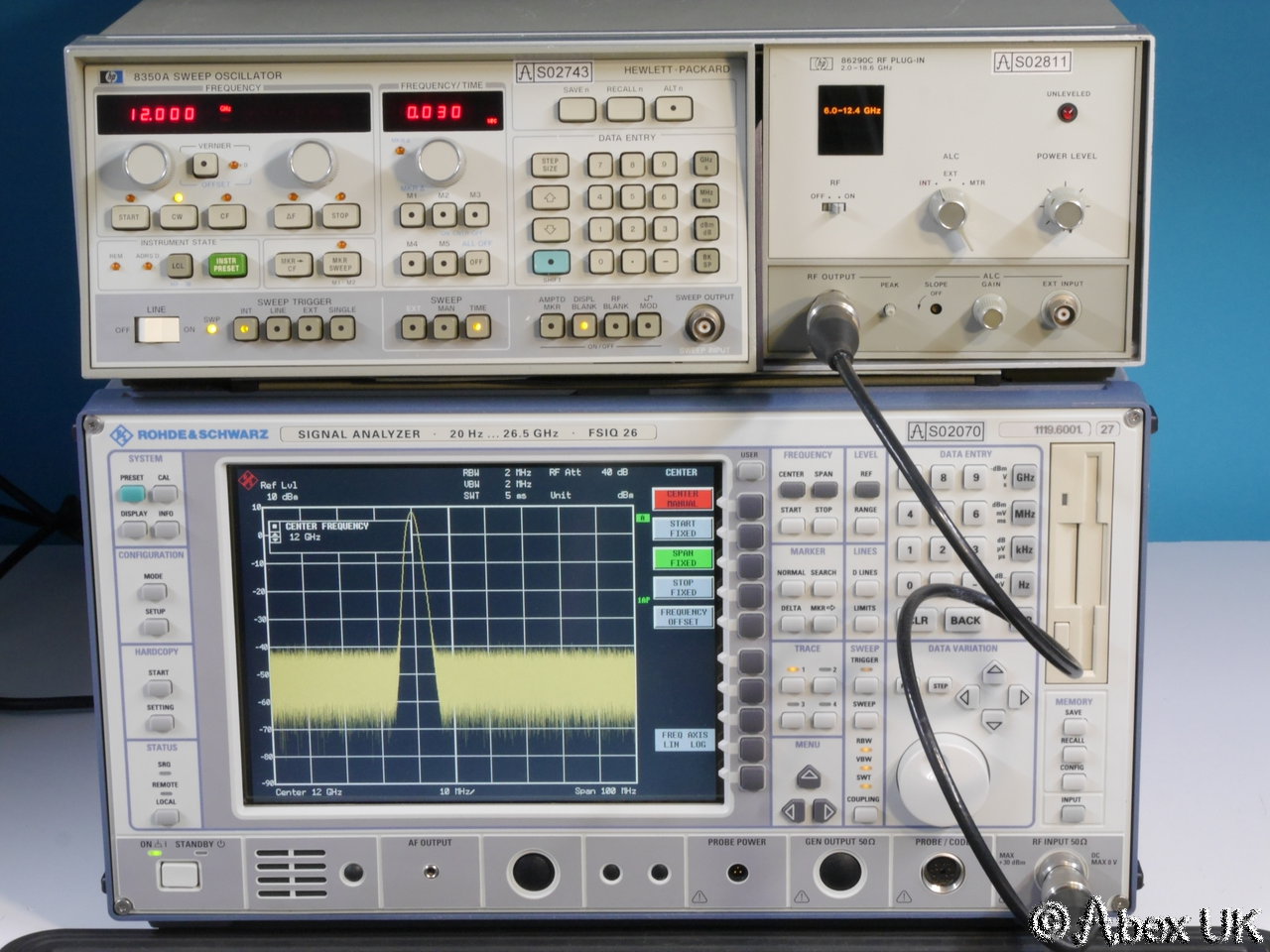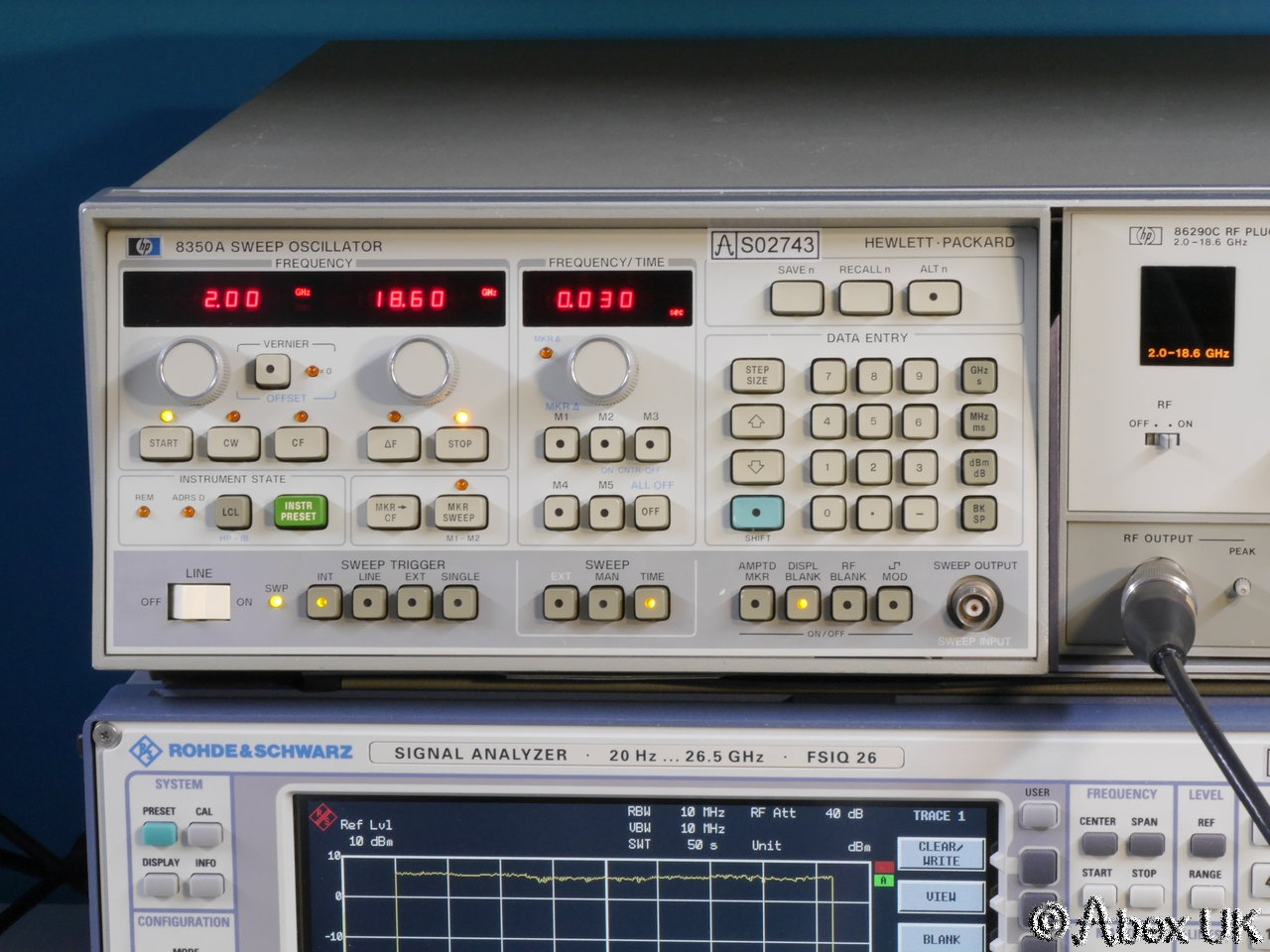 This is a complete HP (Agilent) 8350A sweep generator with an 86290C plug-in and 11869A adaptor, covering 2.0-18.6GHz. This unit is in good cosmetic condition and in good working order as shown below.