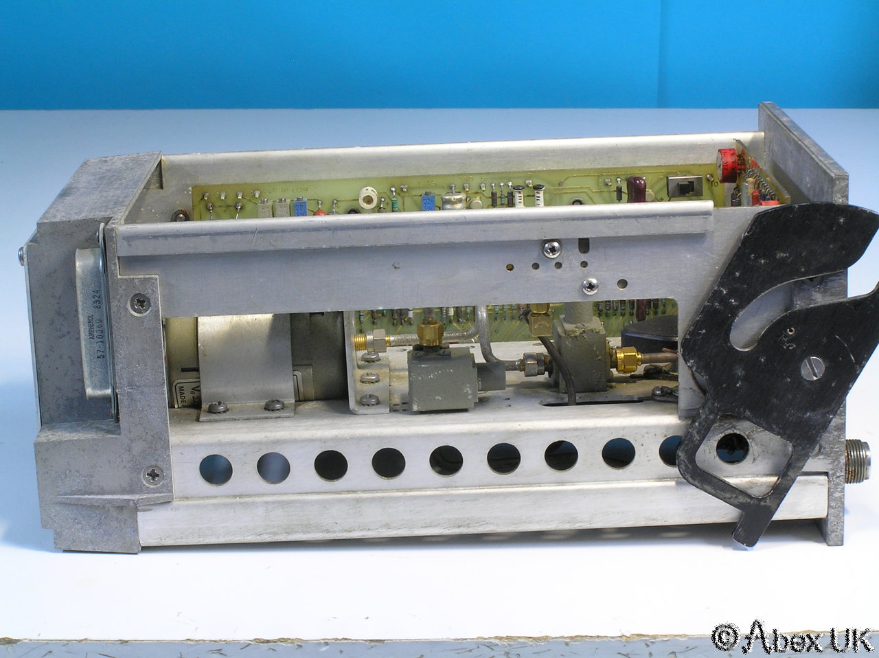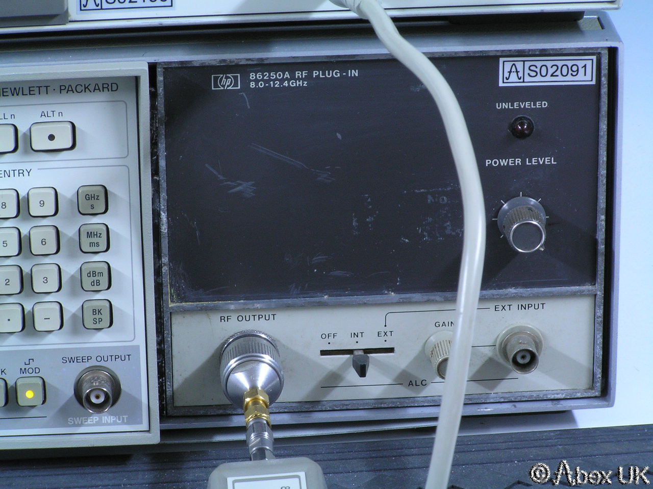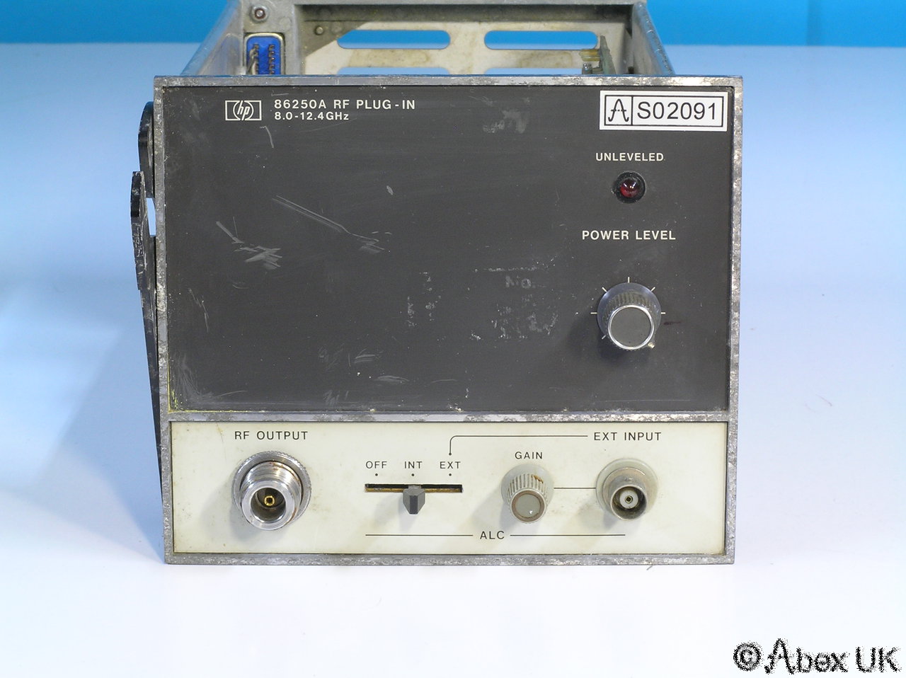 An 86250A RF plug-in covering 8.0 - 12.4GHz. Suits the 8620 series sweepers, or 8350B when used with a 11869A adaptor. In poor cosmetic condition, and not fully working. The RF output sweeps and levels, but the level is low (-30dBm)