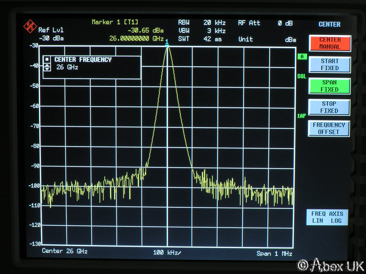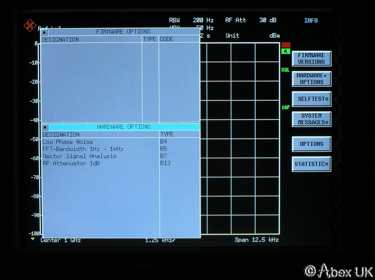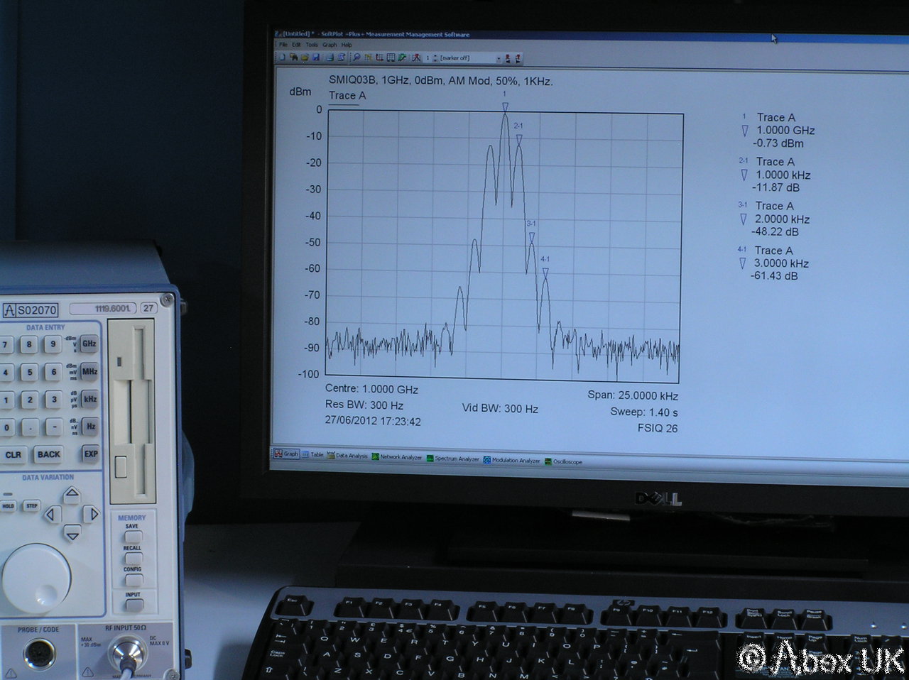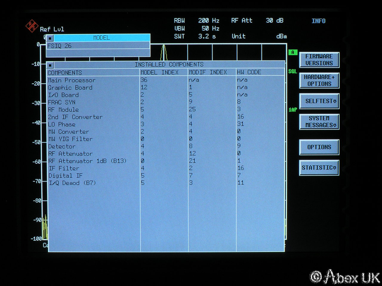 The FSIQ26 is an advanced signal analyser covering 20Hz - 26.5GHz. This unit has options B4, B5, B7 (Vector demod), and B13. It also has the FS-K4 phase noise software, and FS-K3 noise and gain analysis software. See below.