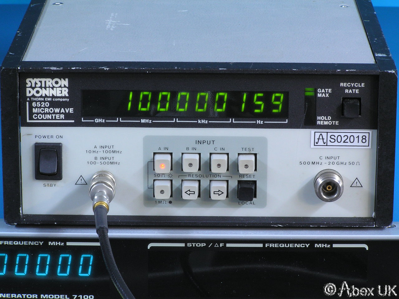 The Systron Donner 6520 is a dual input 500MHz / 20GHz counter. This unit is faulty on the 20GHz input, but the 500MHz input is fully OK. Fair cosmetic condition, rear feet missing. Offered for "Spares or Repair".