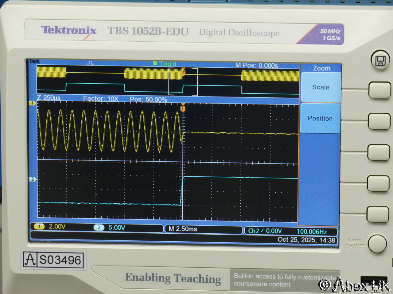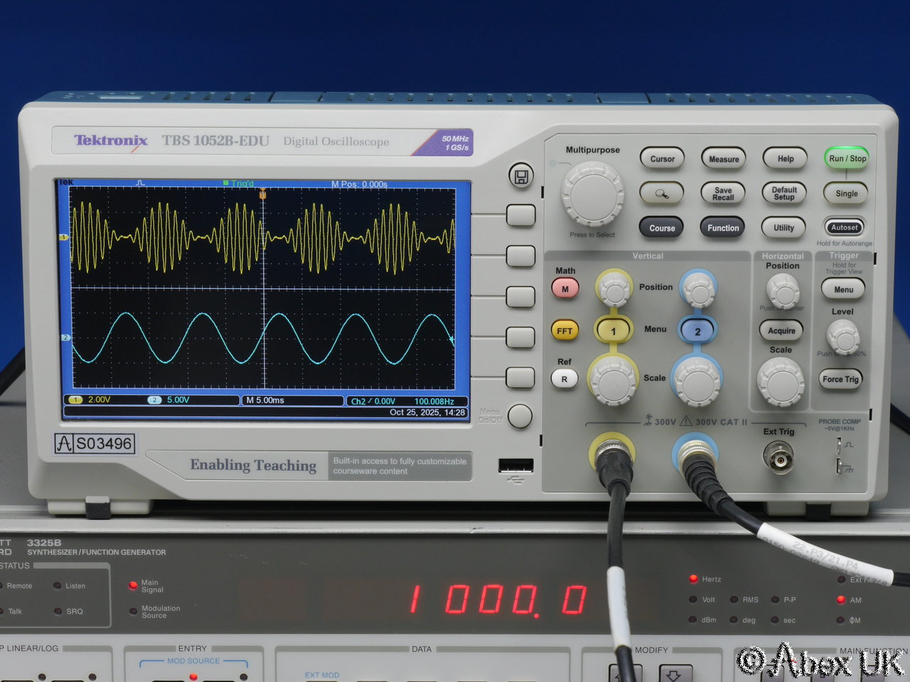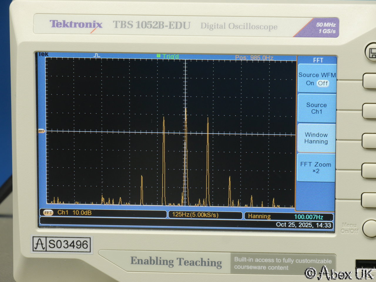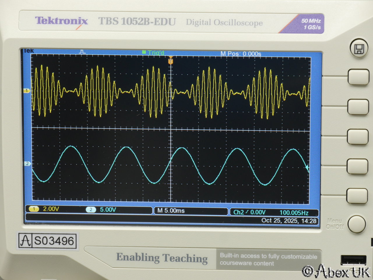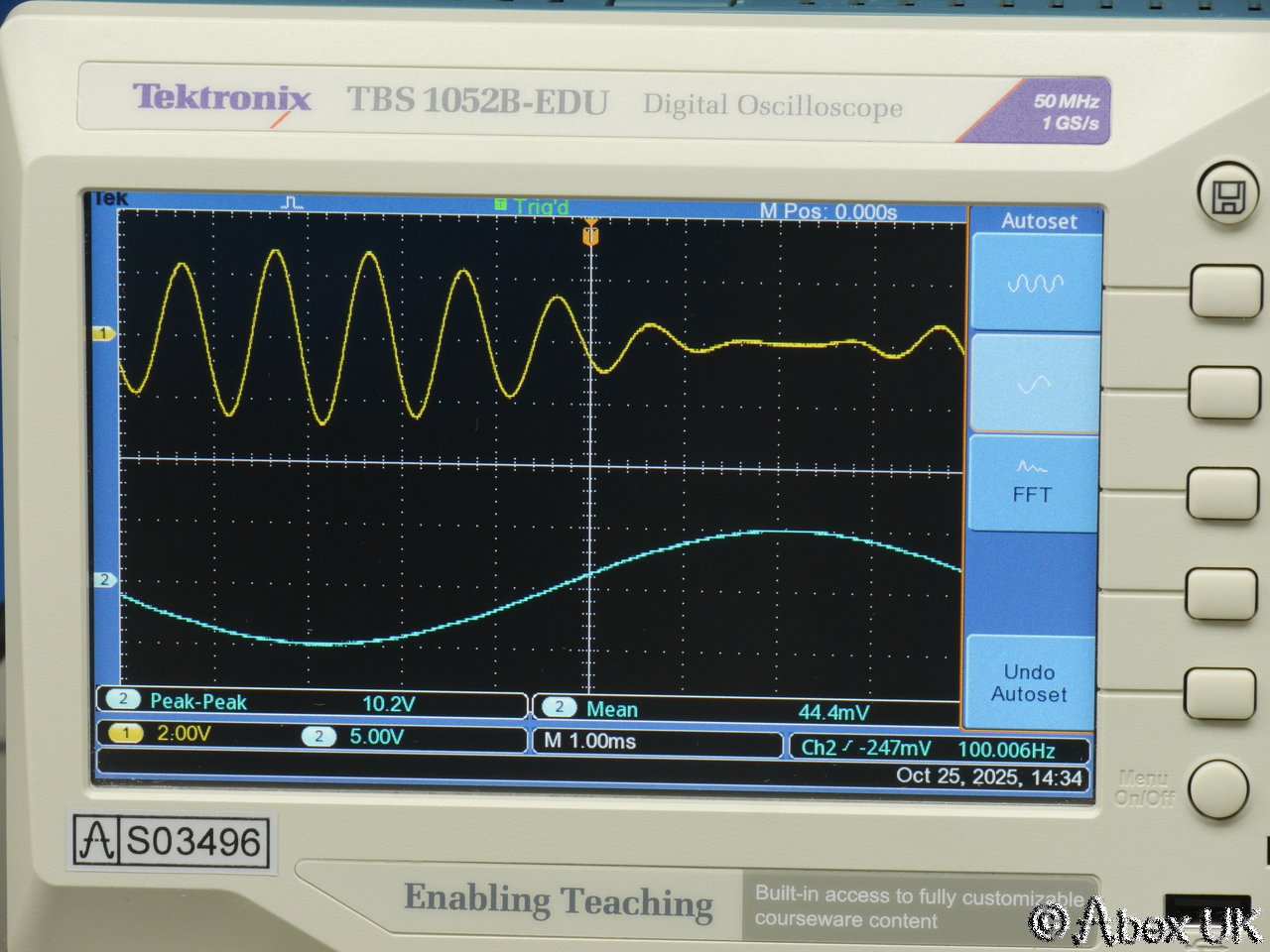 The Tektronix TBS1052B-EDU is a portable 2-channel digital oscilloscope with 50MHz bandwidth and up to 1GS/s sample rate. It is packed with productivity features such as autoset, cursors and measurement functions. X10 zoom (delayed timebase), a powerful and very useful FFT spectrum analyser function, and a 2-channel frequency count function. Built in trace maths. USB connectivity.