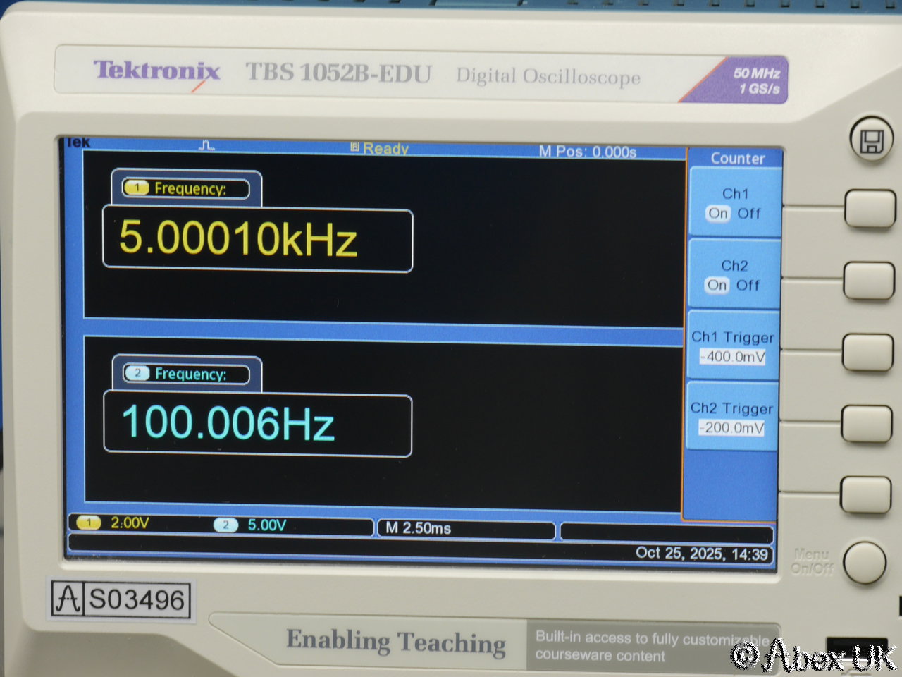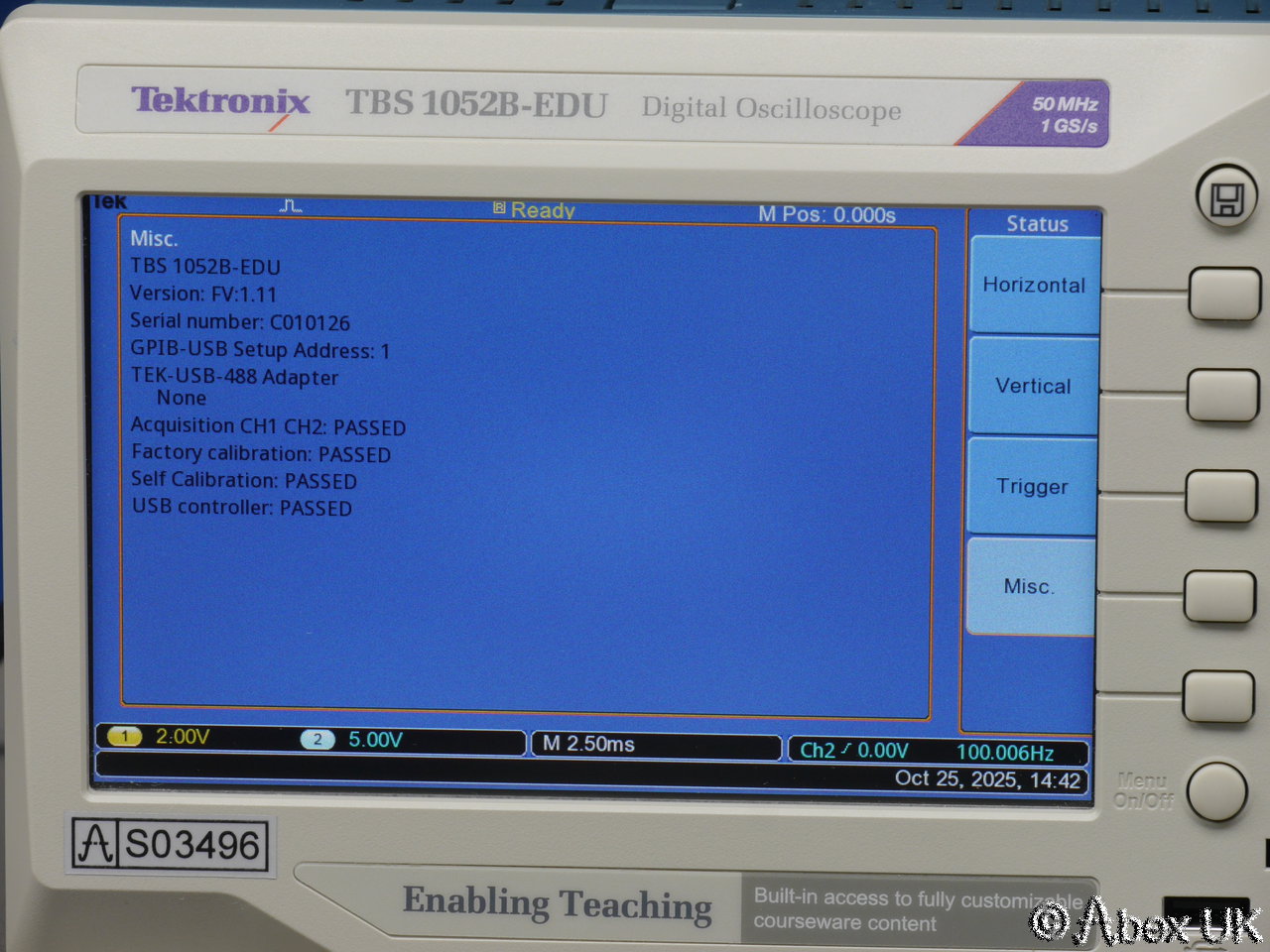 Tektronix TBS1052B-EDUDigital Oscilloscope 50MHz 1GS/s(Serial Number c010126 , Stock Number s03496) |