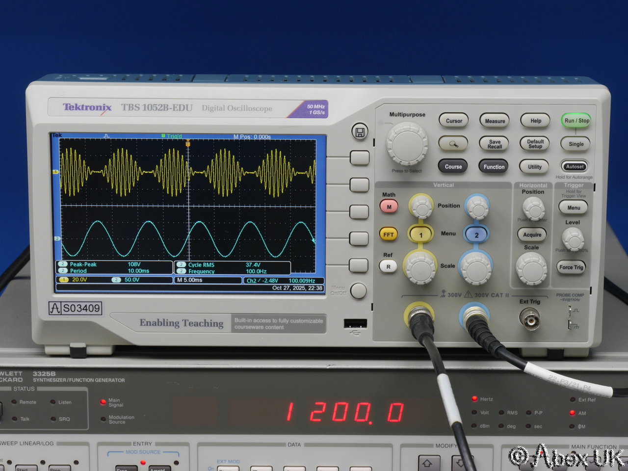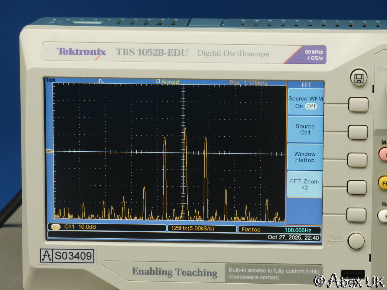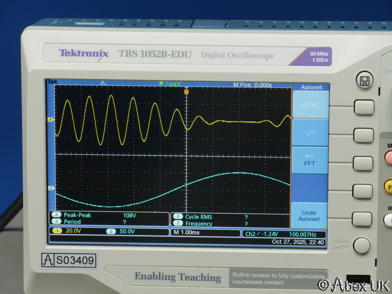 The Tektronix TBS1052B-EDU is a portable 2-channel digital oscilloscope with 50MHz bandwidth and up to 1GS/s sample rate. It is packed with productivity features such as autoset, cursors and measurement functions. X10 zoom (delayed timebase), a powerful and very useful FFT spectrum analyser function, and a 2-channel frequency count function. Built in trace maths. USB connectivity.
