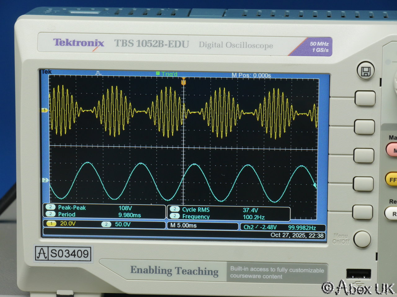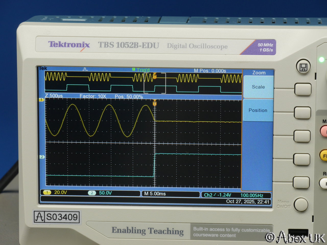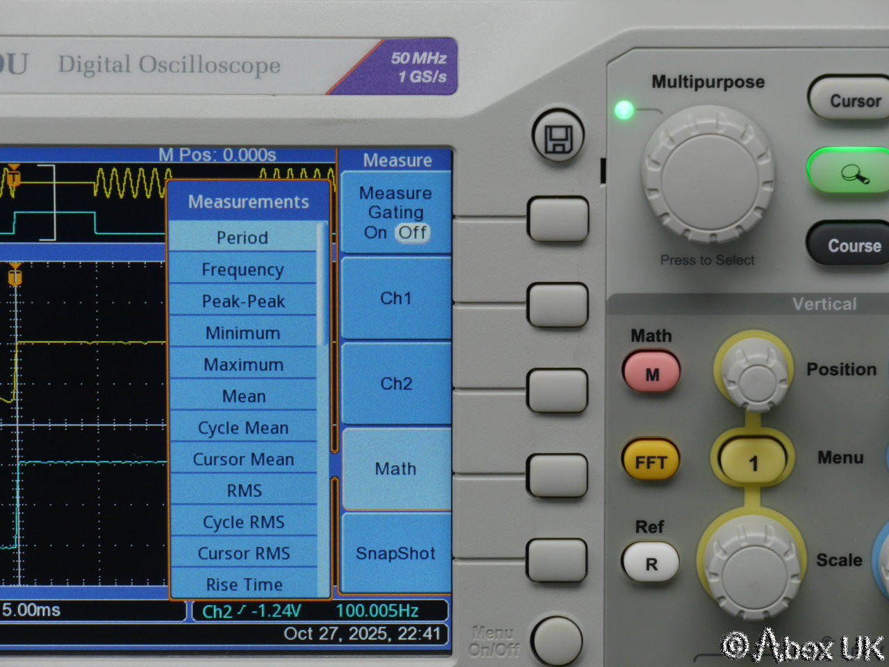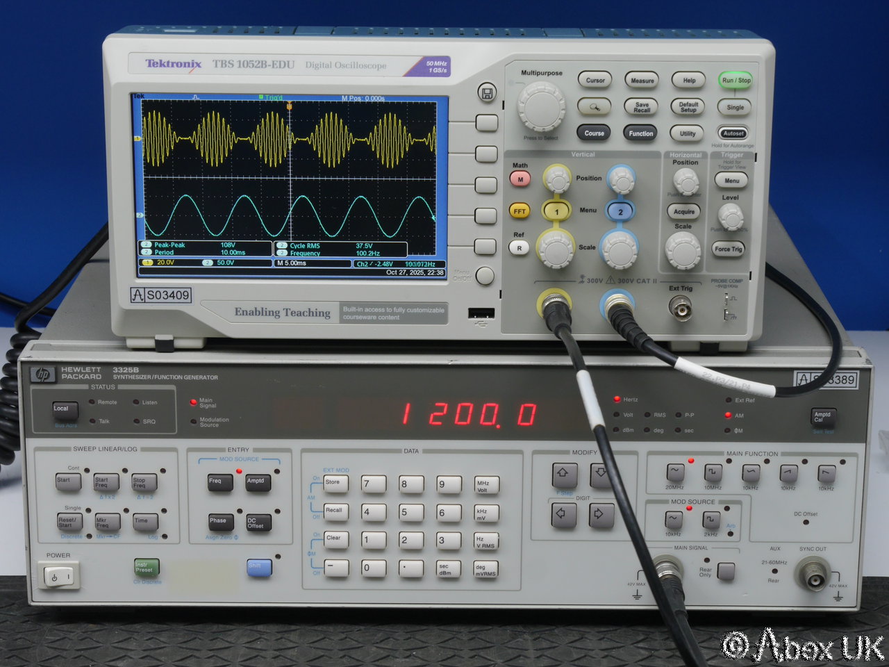 The Tektronix TBS1052B-EDU is a portable 2-channel digital oscilloscope with 50MHz bandwidth and up to 1GS/s sample rate. It is packed with productivity features such as autoset, cursors and measurement functions. X10 zoom (delayed timebase), a powerful and very useful FFT spectrum analyser function, and a 2-channel frequency count function. Built in trace maths. USB connectivity.