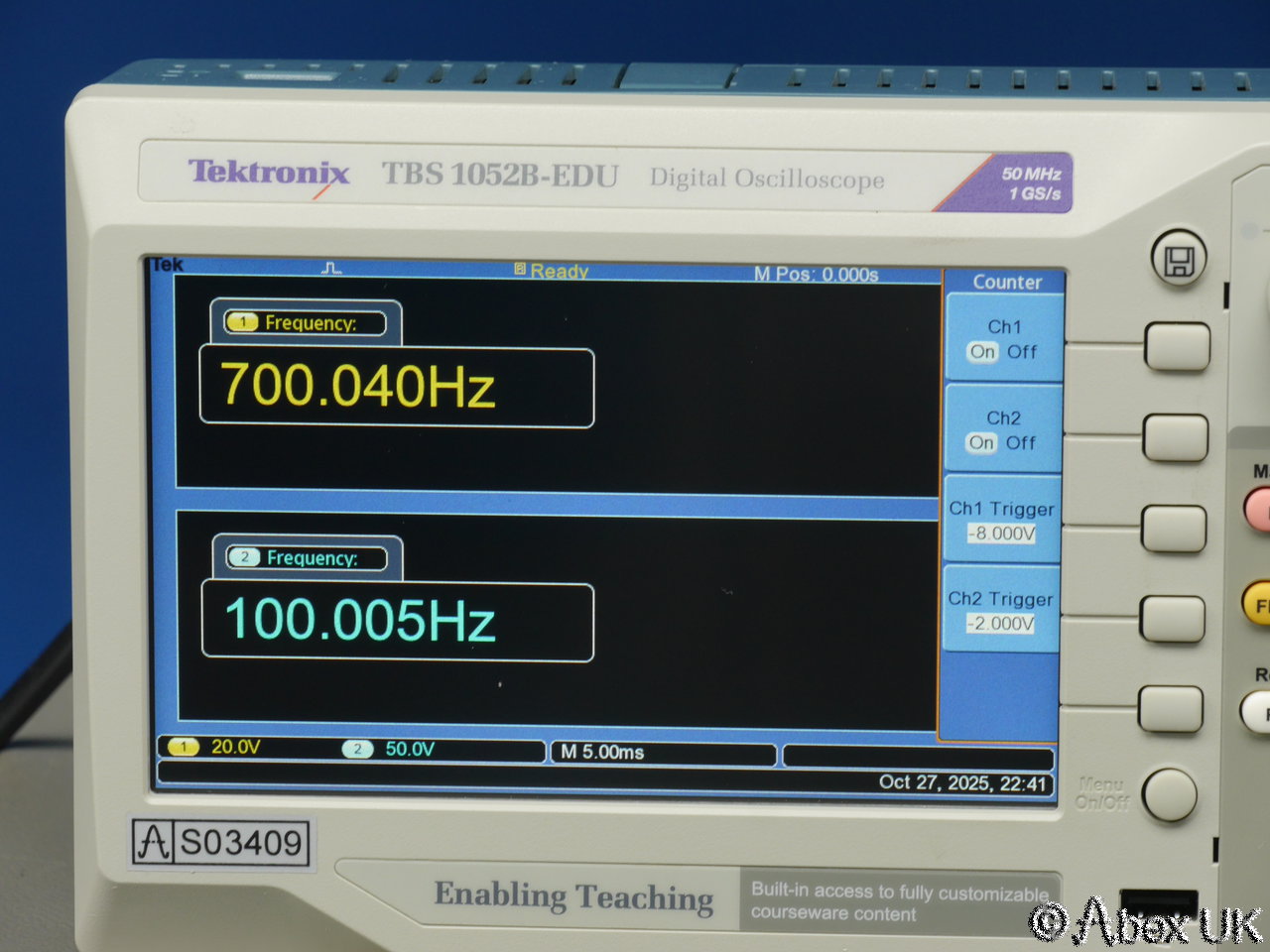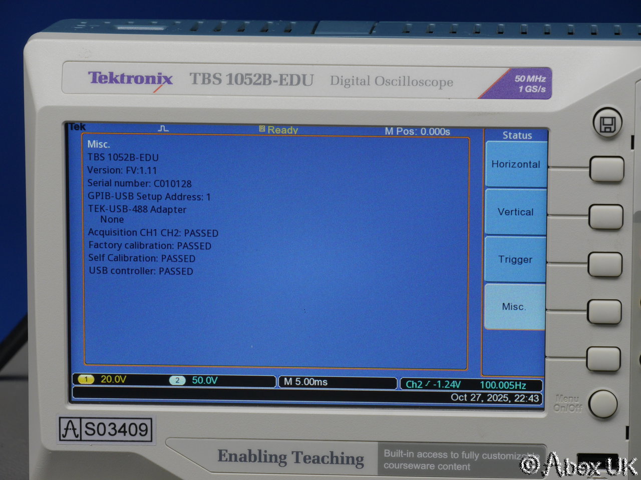 Tektronix TBS1052B-EDUDigital Oscilloscope 50MHz 1GS/s(Serial Number c010128 , Stock Number s03409) |