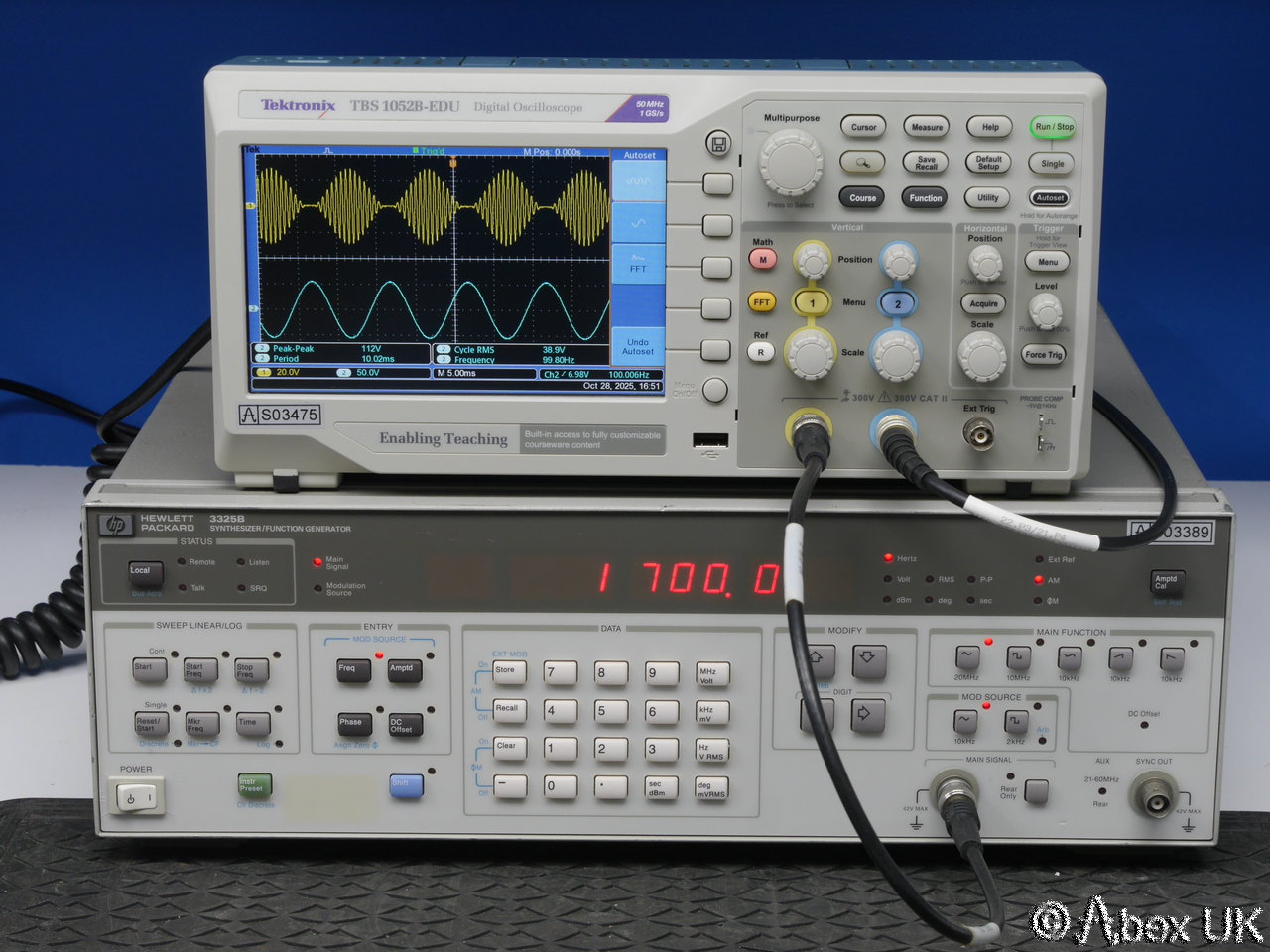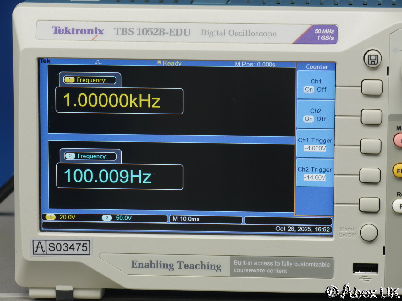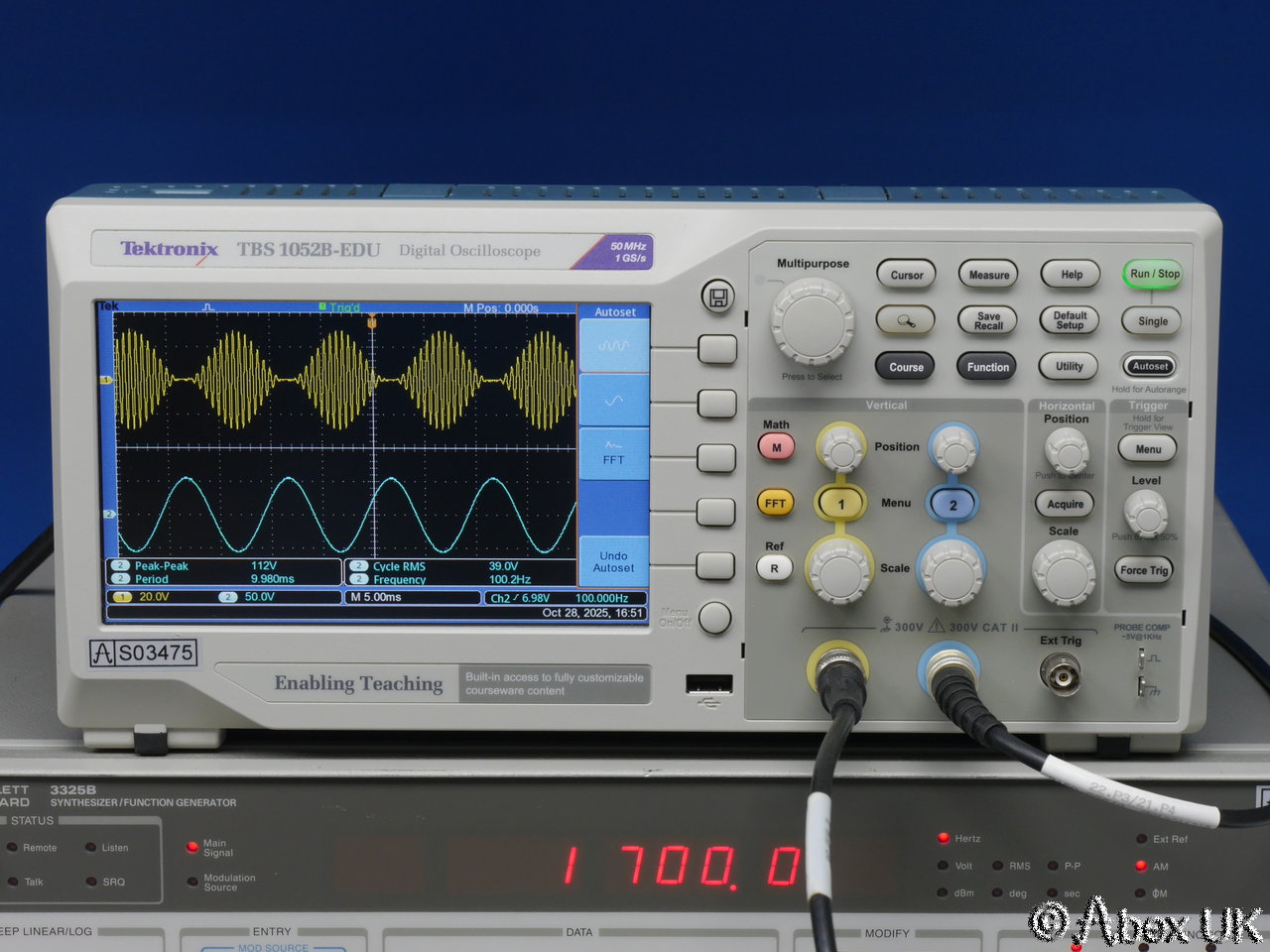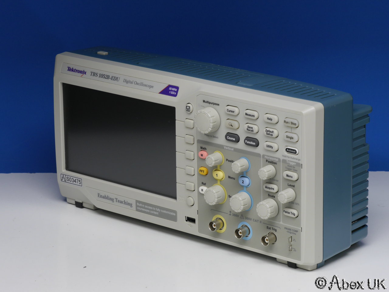 The Tektronix TBS1052B-EDU is a portable 2-channel digital oscilloscope with 50MHz bandwidth and up to 1GS/s sample rate. It is packed with productivity features such as autoset, cursors and measurement functions. X10 zoom (delayed timebase), a powerful and very useful FFT spectrum analyser function, and a 2-channel frequency count function. Built in trace maths. USB connectivity.