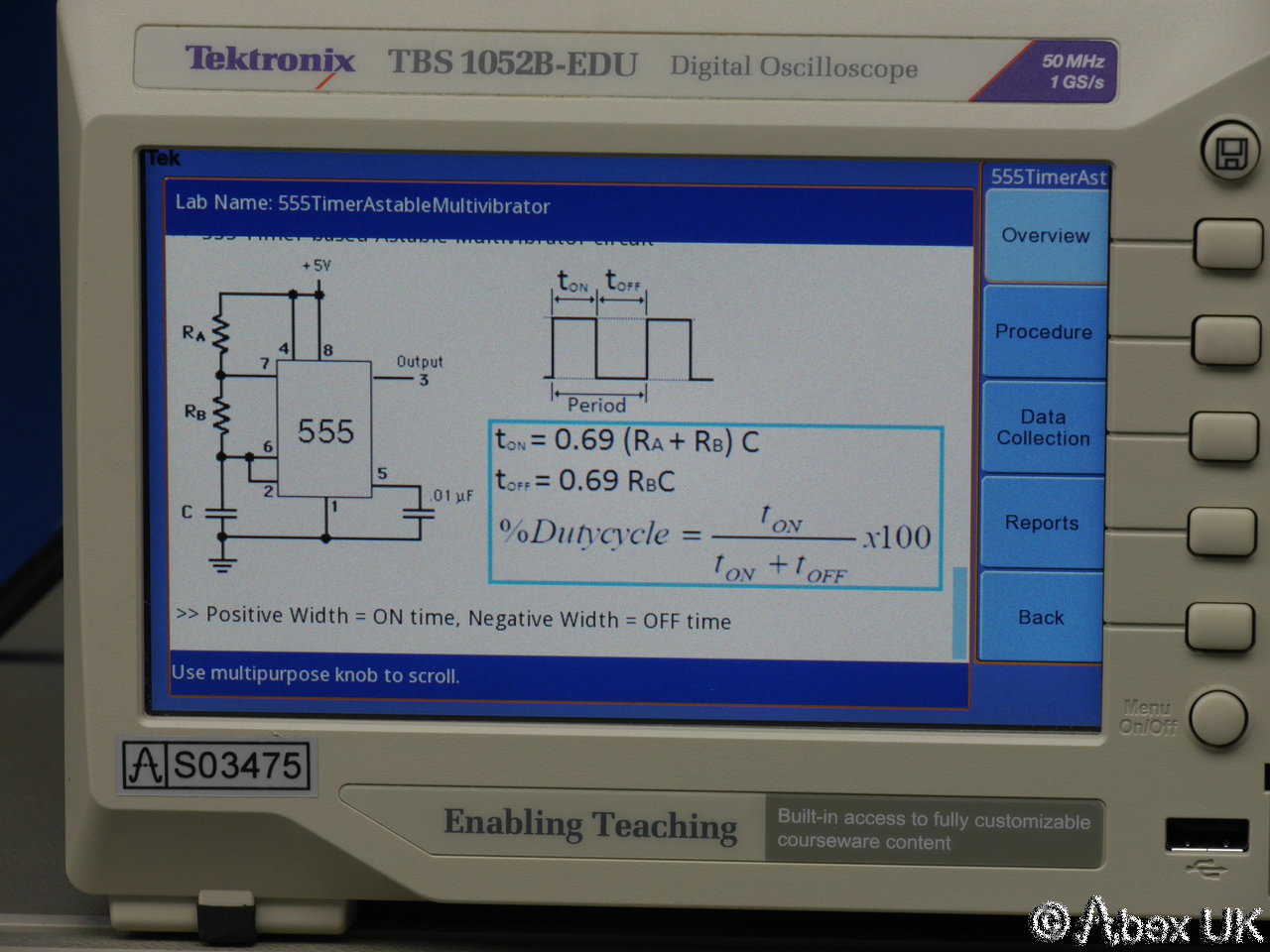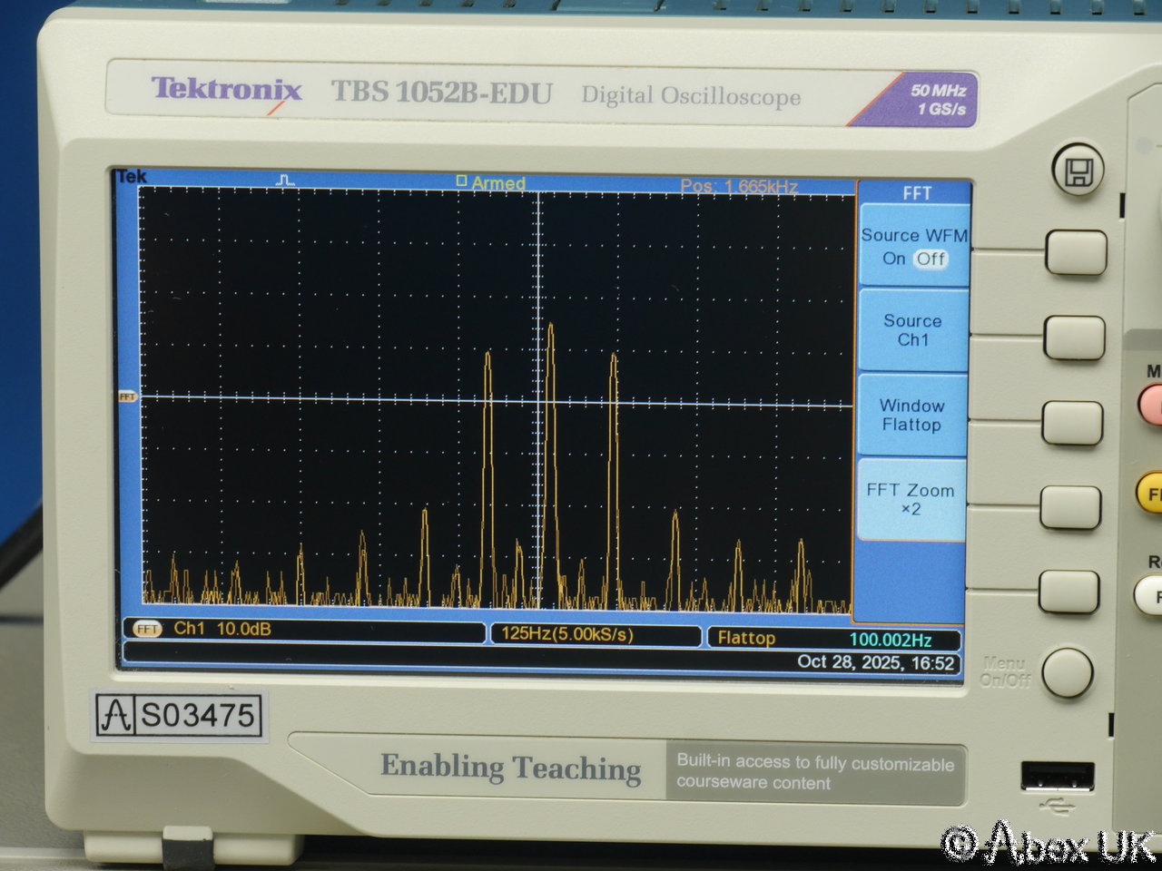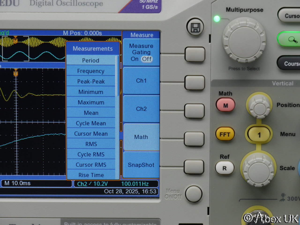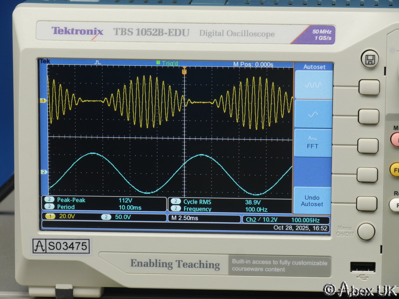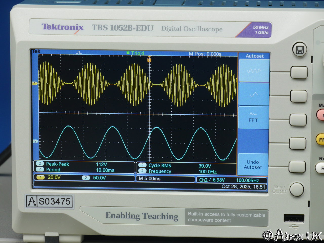 The Tektronix TBS1052B-EDU is a portable 2-channel digital oscilloscope with 50MHz bandwidth and up to 1GS/s sample rate. It is packed with productivity features such as autoset, cursors and measurement functions. X10 zoom (delayed timebase), a powerful and very useful FFT spectrum analyser function, and a 2-channel frequency count function. Built in trace maths. USB connectivity.