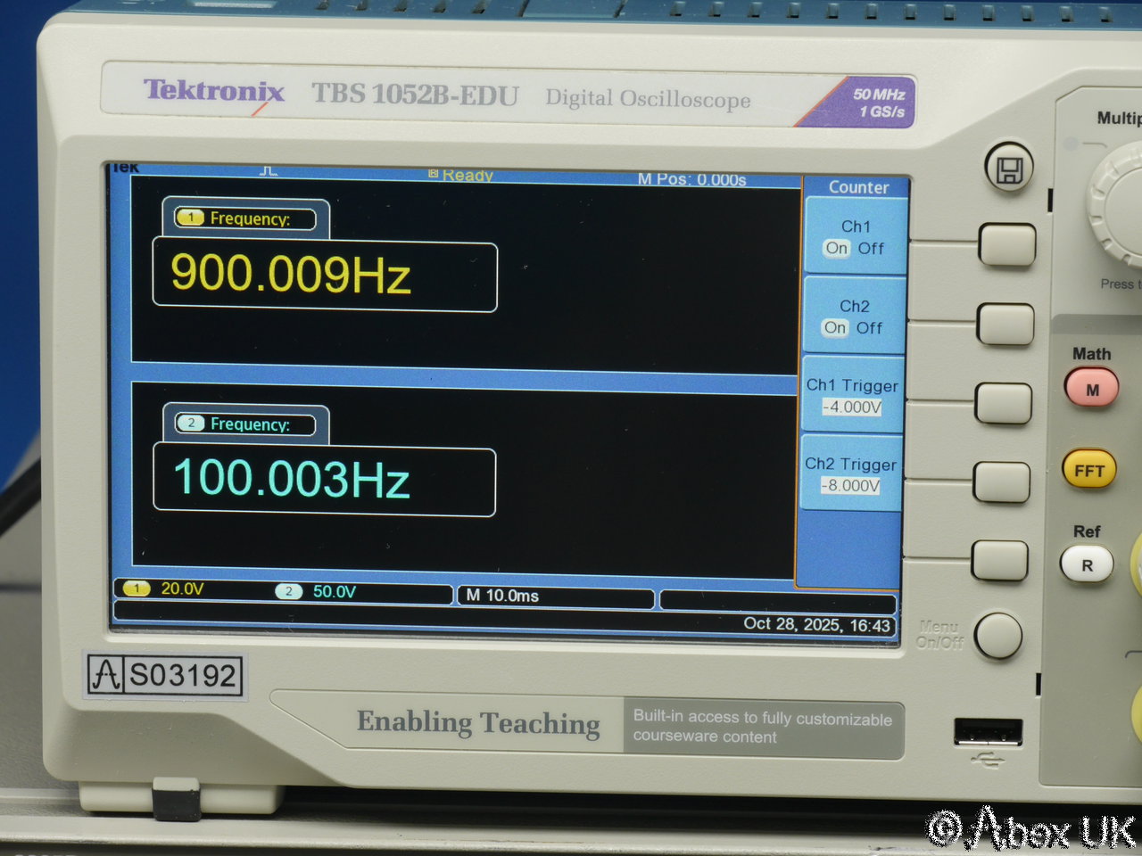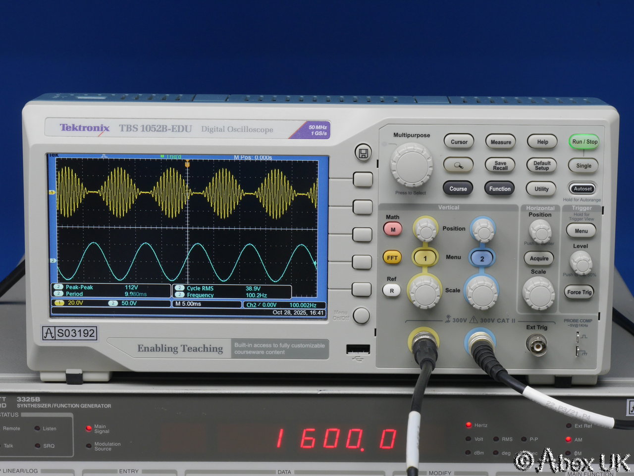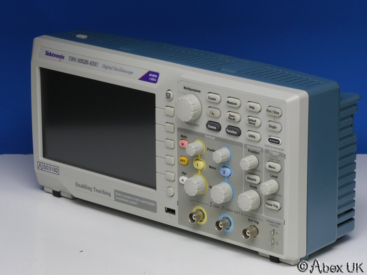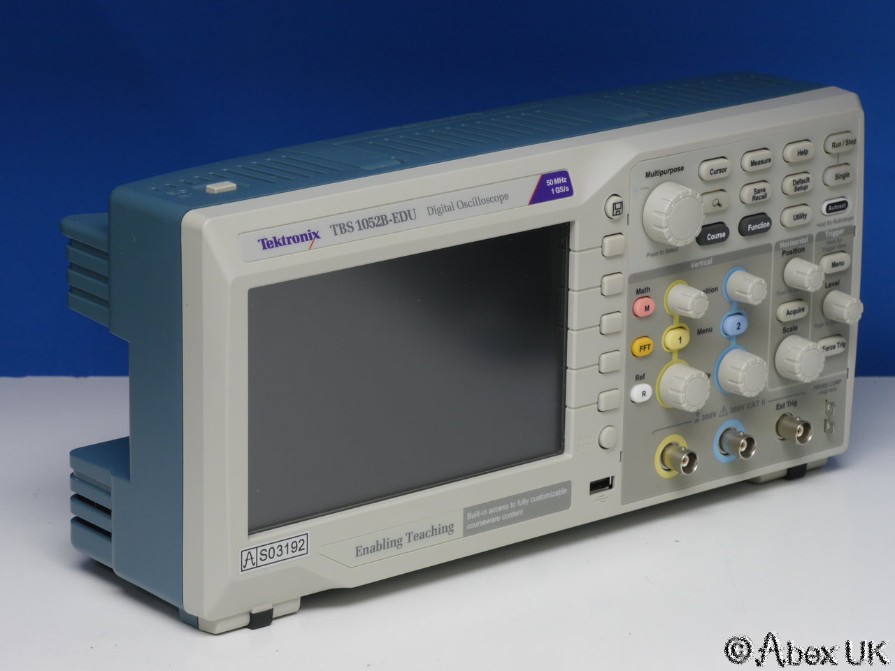 The Tektronix TBS1052B-EDU is a portable 2-channel digital oscilloscope with 50MHz bandwidth and up to 1GS/s sample rate. It is packed with productivity features such as autoset, cursors and measurement functions. X10 zoom (delayed timebase), a powerful and very useful FFT spectrum analyser function, and a 2-channel frequency count function. Built in trace maths. USB connectivity.