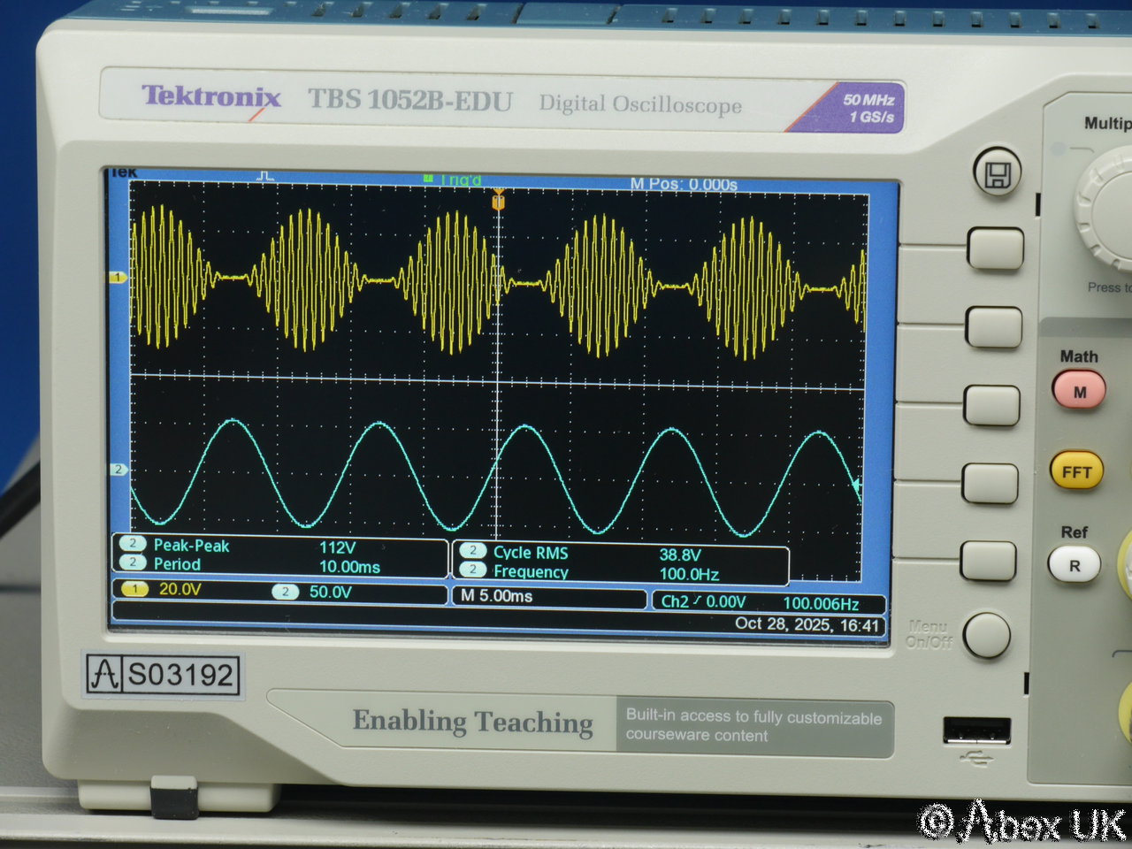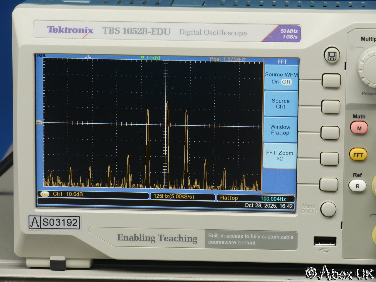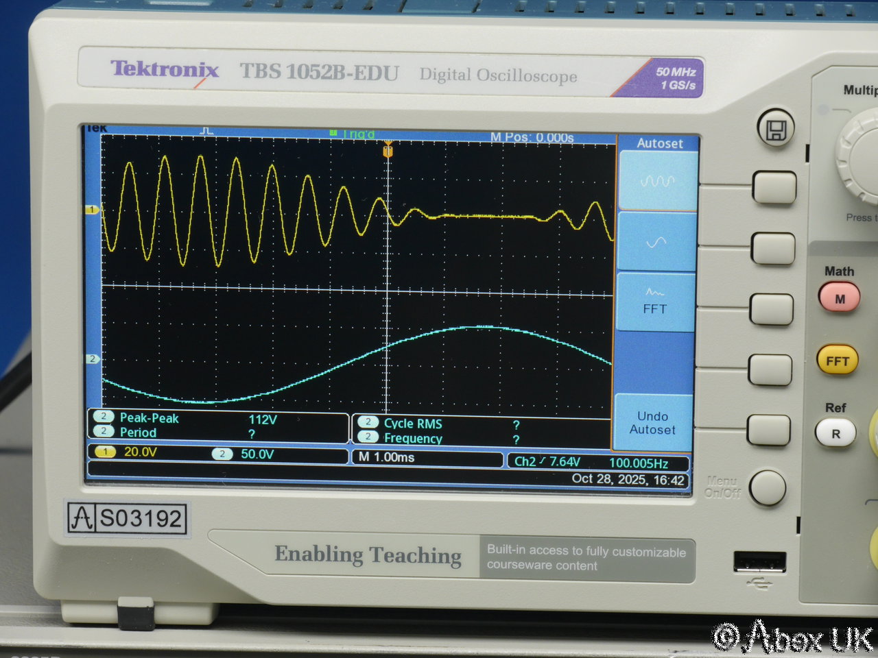 The Tektronix TBS1052B-EDU is a portable 2-channel digital oscilloscope with 50MHz bandwidth and up to 1GS/s sample rate. It is packed with productivity features such as autoset, cursors and measurement functions. X10 zoom (delayed timebase), a powerful and very useful FFT spectrum analyser function, and a 2-channel frequency count function. Built in trace maths. USB connectivity.