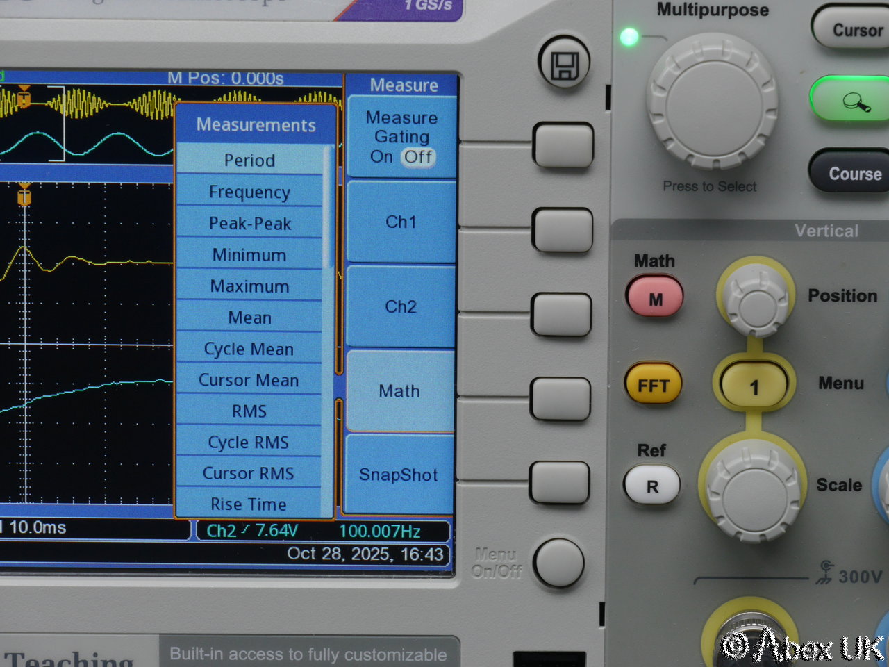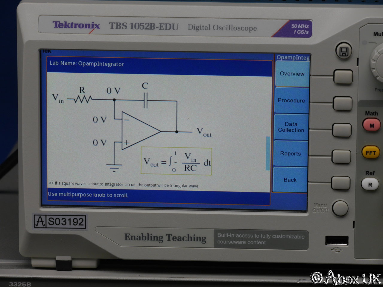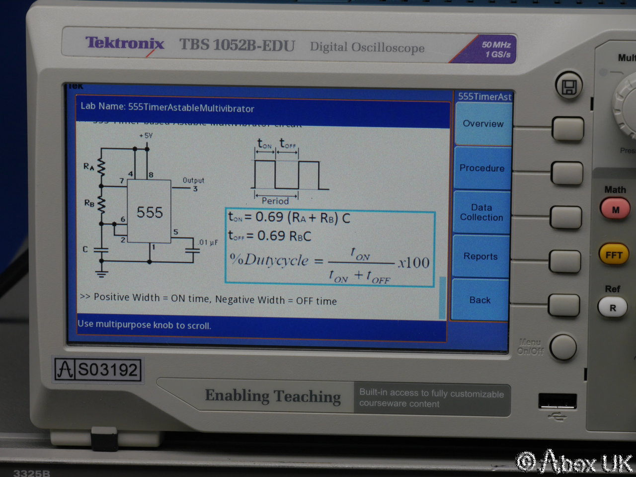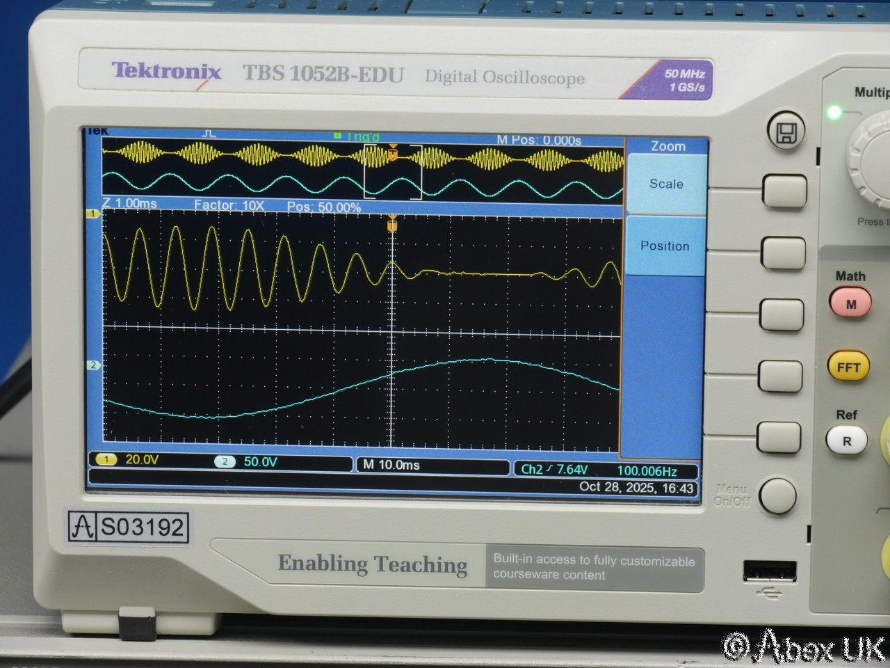 The Tektronix TBS1052B-EDU is a portable 2-channel digital oscilloscope with 50MHz bandwidth and up to 1GS/s sample rate. It is packed with productivity features such as autoset, cursors and measurement functions. X10 zoom (delayed timebase), a powerful and very useful FFT spectrum analyser function, and a 2-channel frequency count function. Built in trace maths. USB connectivity.