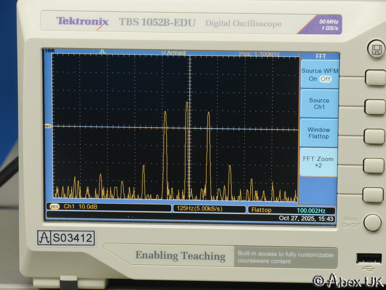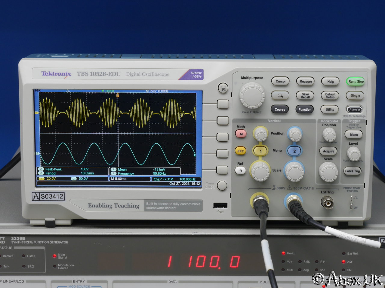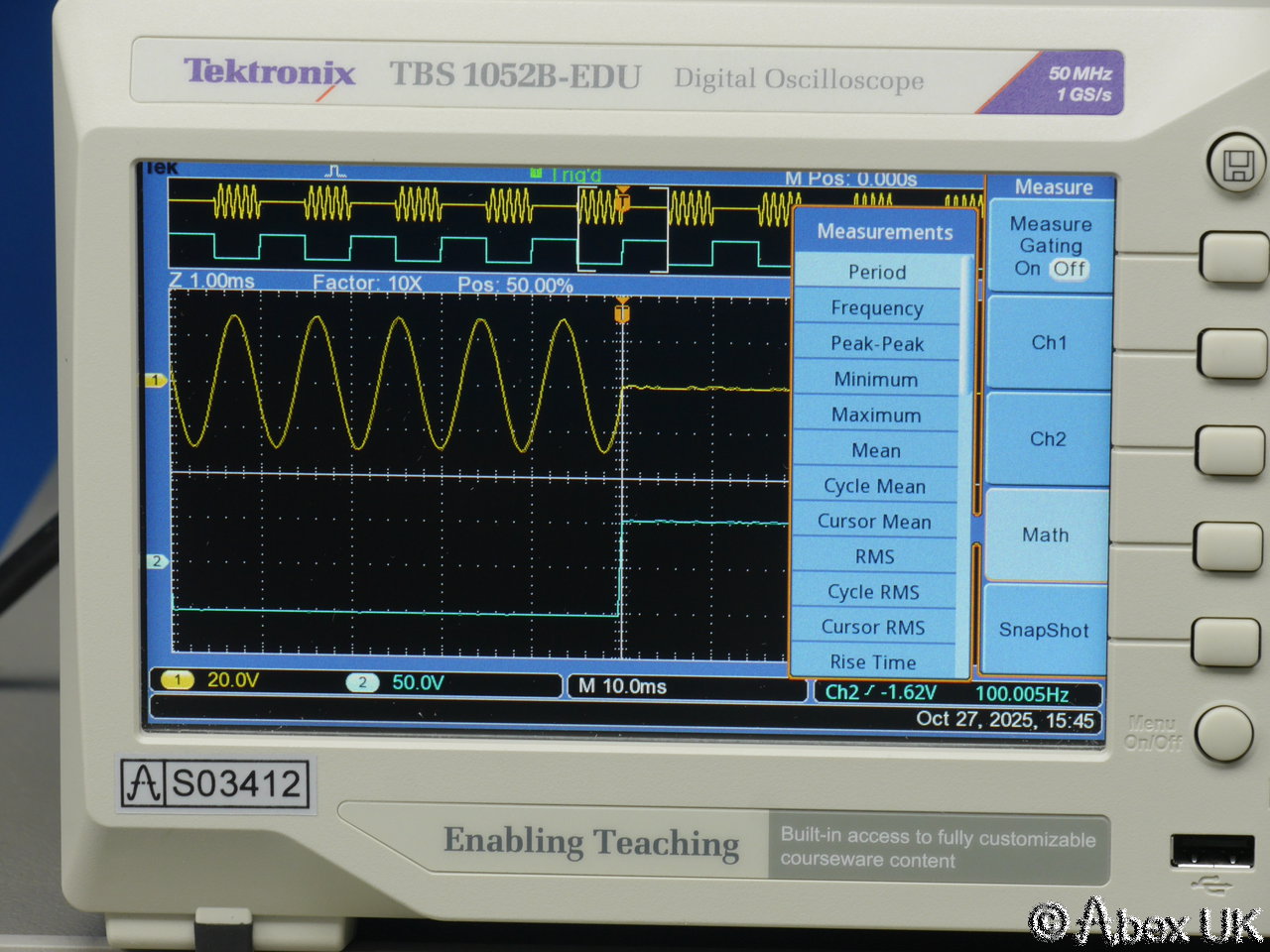 The Tektronix TBS1052B-EDU is a portable 2-channel digital oscilloscope with 50MHz bandwidth and up to 1GS/s sample rate. It is packed with productivity features such as autoset, cursors and measurement functions. X10 zoom (delayed timebase), a powerful and very useful FFT spectrum analyser function, and a 2-channel frequency count function. Built in trace maths. USB connectivity.