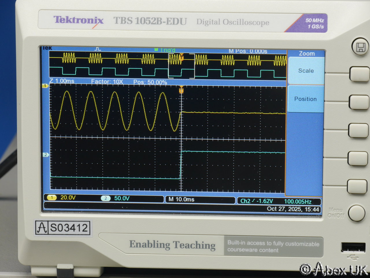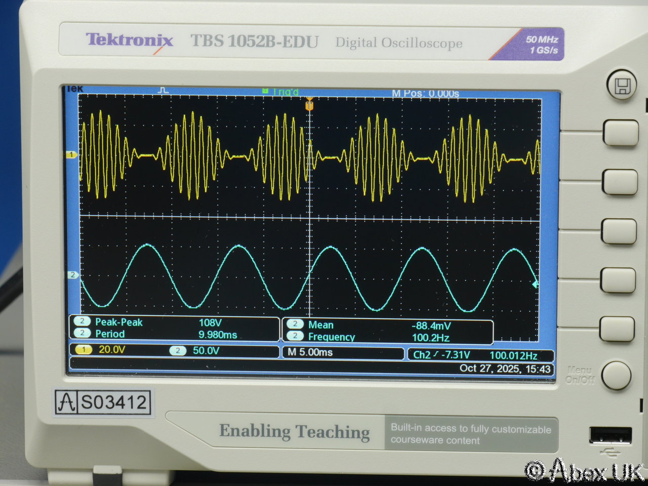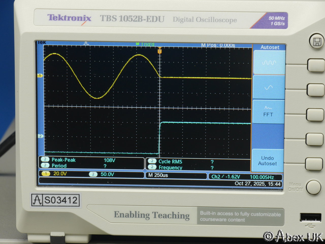 The Tektronix TBS1052B-EDU is a portable 2-channel digital oscilloscope with 50MHz bandwidth and up to 1GS/s sample rate. It is packed with productivity features such as autoset, cursors and measurement functions. X10 zoom (delayed timebase), a powerful and very useful FFT spectrum analyser function, and a 2-channel frequency count function. Built in trace maths. USB connectivity.