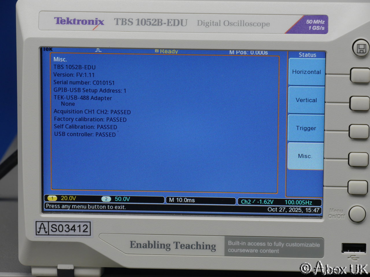 Tektronix TBS1052B-EDUDigital Oscilloscope 50MHz 1GS/s(Serial Number c010151 , Stock Number s03412) |