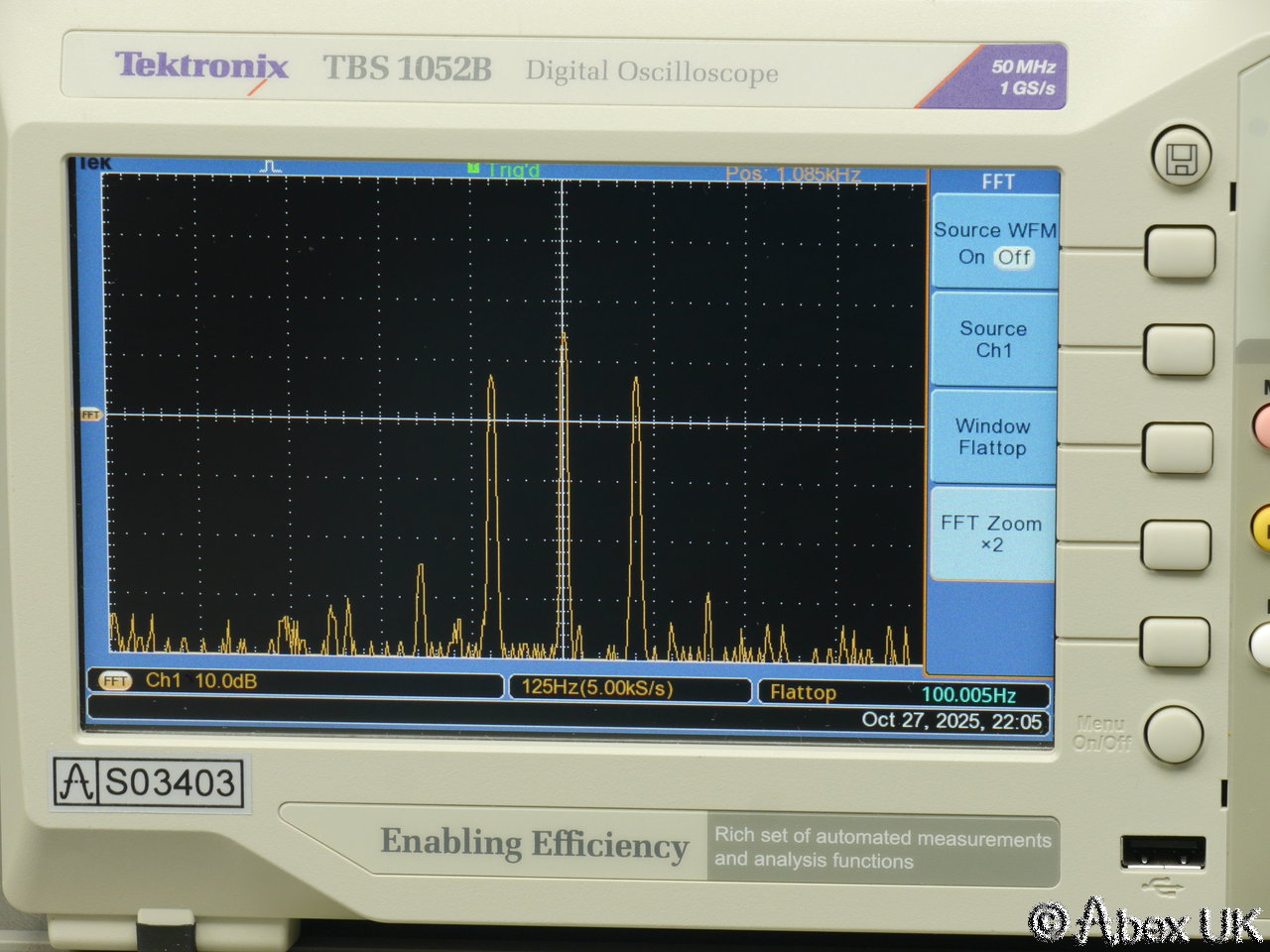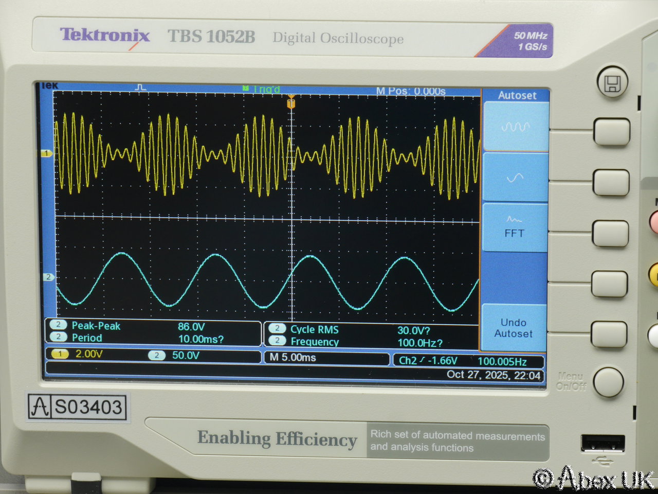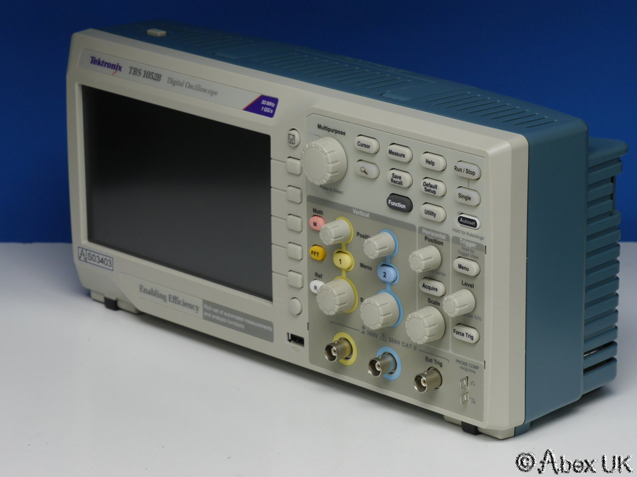 The Tektronix TBS1052B is a portable 2-channel digital oscilloscope with 50MHz bandwidth and up to 1GS/s sample rate. It is packed with productivity features such as autoset, cursors and measurement functions. X10 zoom (delayed timebase), a powerful and very useful FFT spectrum analyser function, and a 2-channel frequency count function. Built in trace maths. USB connectivity.