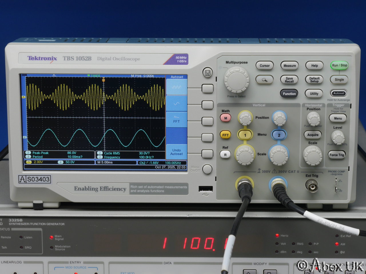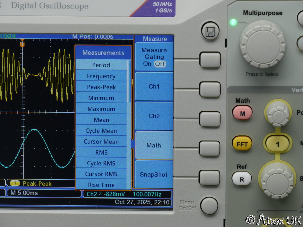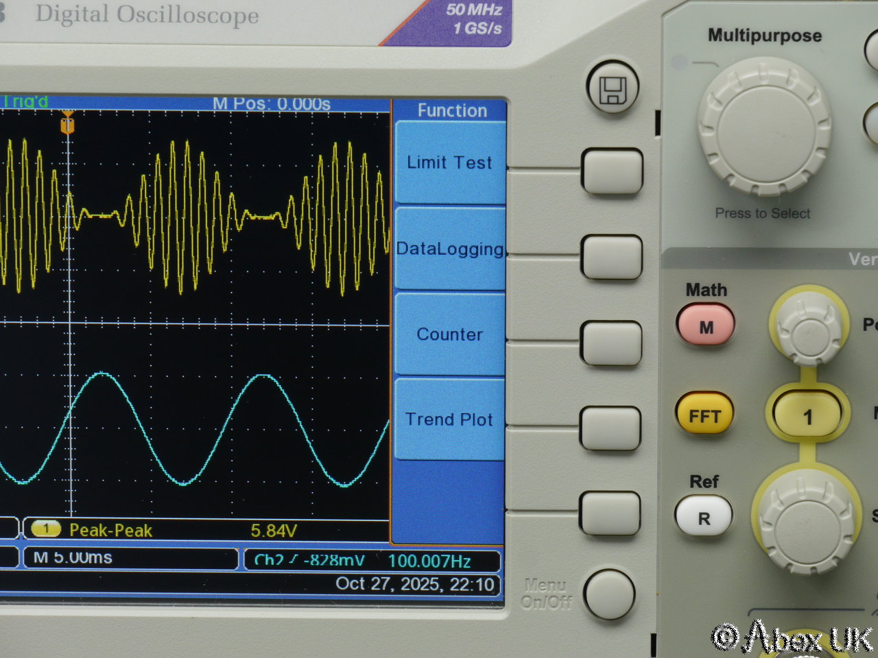 The Tektronix TBS1052B is a portable 2-channel digital oscilloscope with 50MHz bandwidth and up to 1GS/s sample rate. It is packed with productivity features such as autoset, cursors and measurement functions. X10 zoom (delayed timebase), a powerful and very useful FFT spectrum analyser function, and a 2-channel frequency count function. Built in trace maths. USB connectivity.