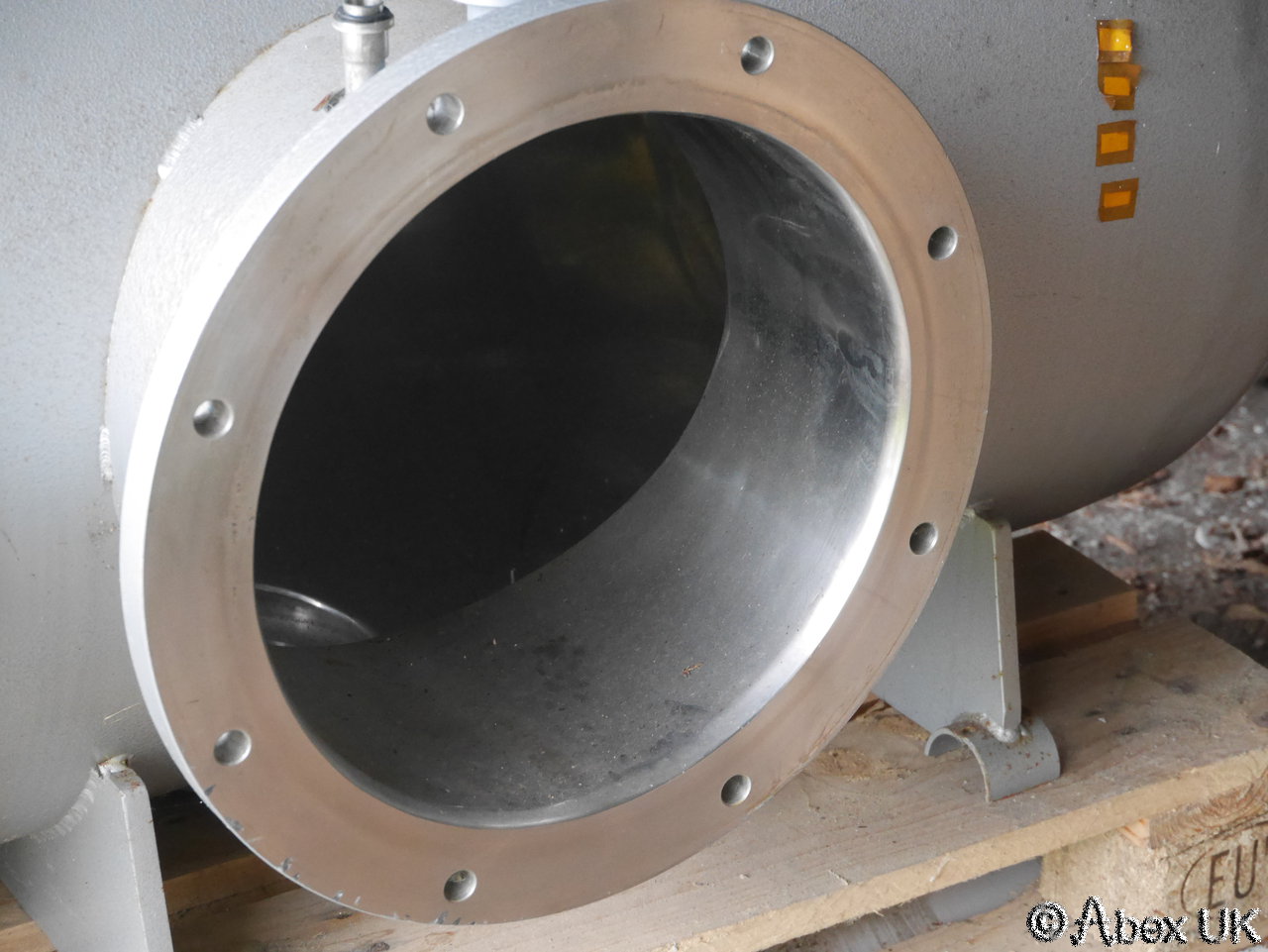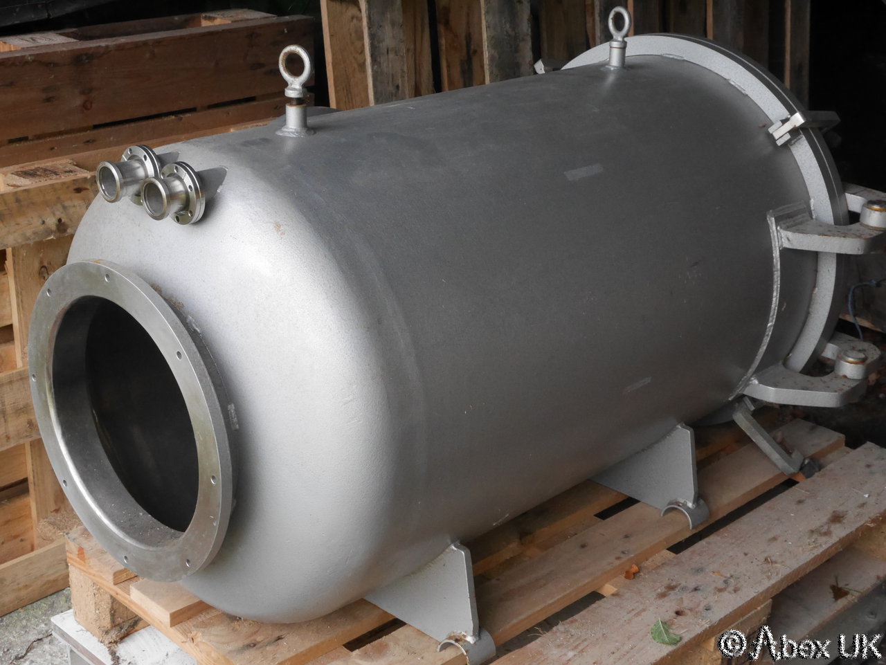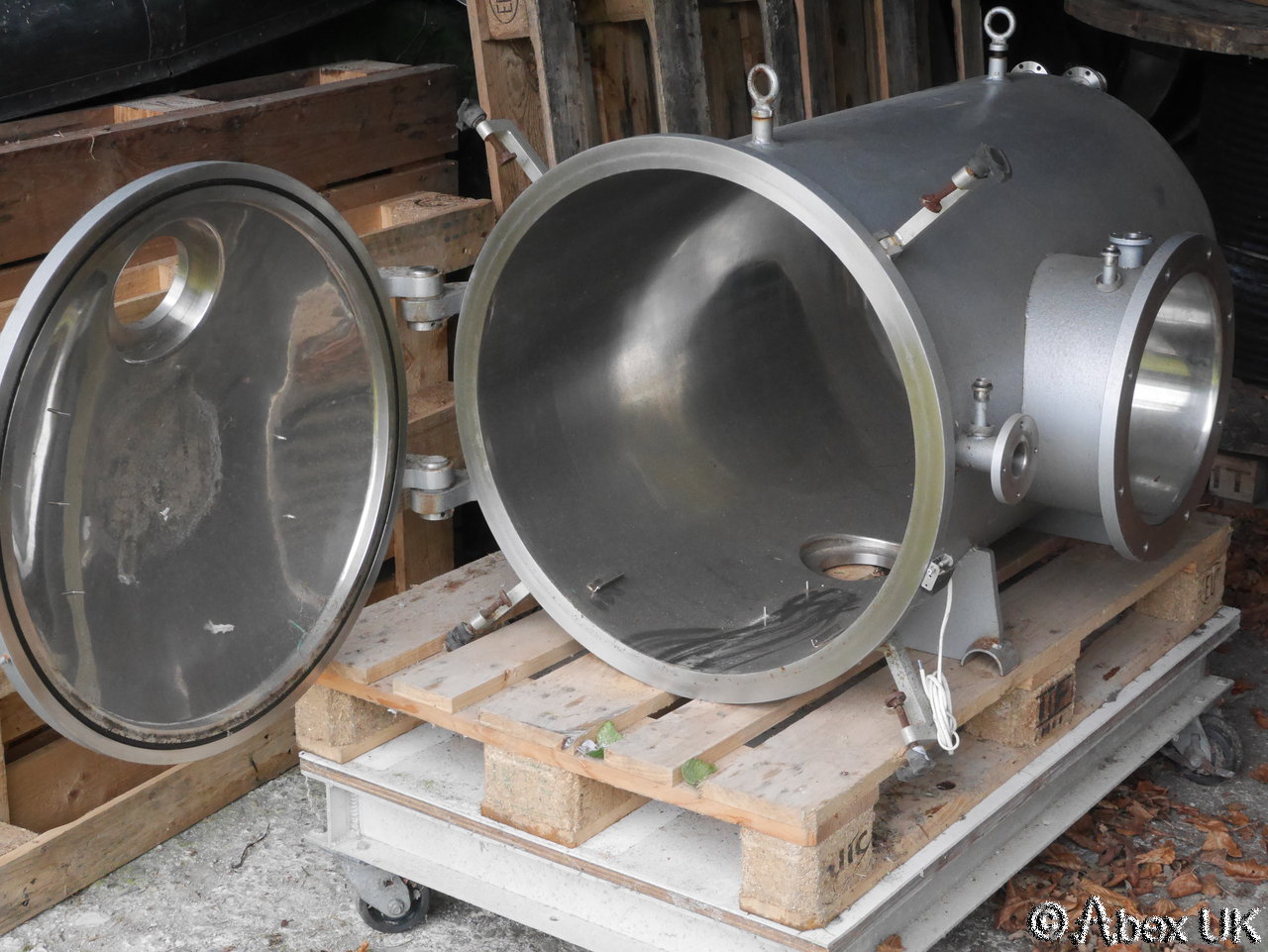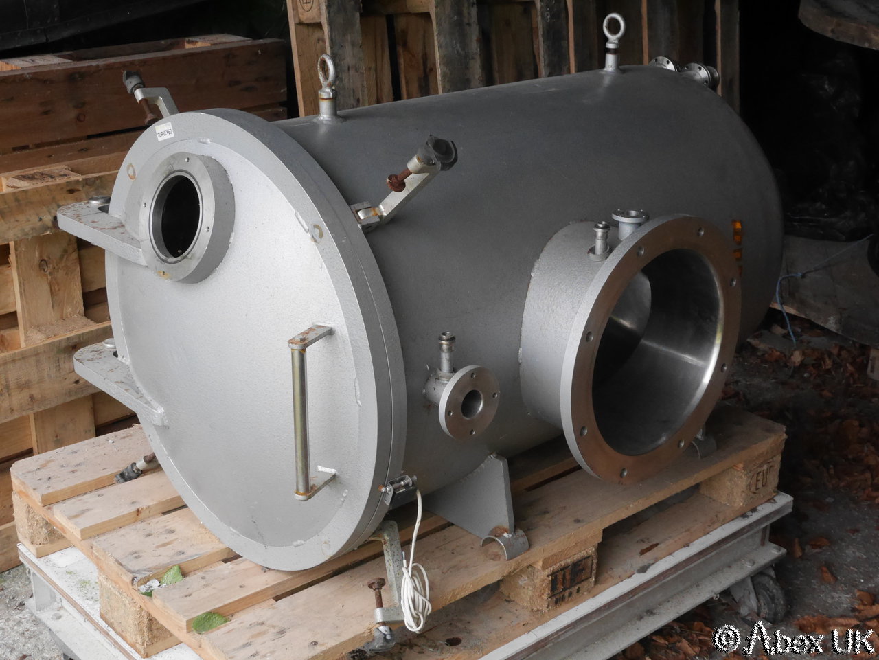 Large stainless steel vacuum chamber, approx 60cm diameter (internal) x100cm long. Multiple ports as shown in the photos. Hinged door. Original application unknown. High quality. In good condition.