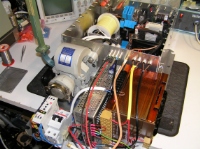 As seen here, the 16GHz magnetron is quite large and it was only just possible to fit it in the required chassis. It is mounted OUTSIDE of the HV enclosure, except for the cathode/heater connection which passes through the wall. This arrangement does not result an any additional radiation or leakage issues.